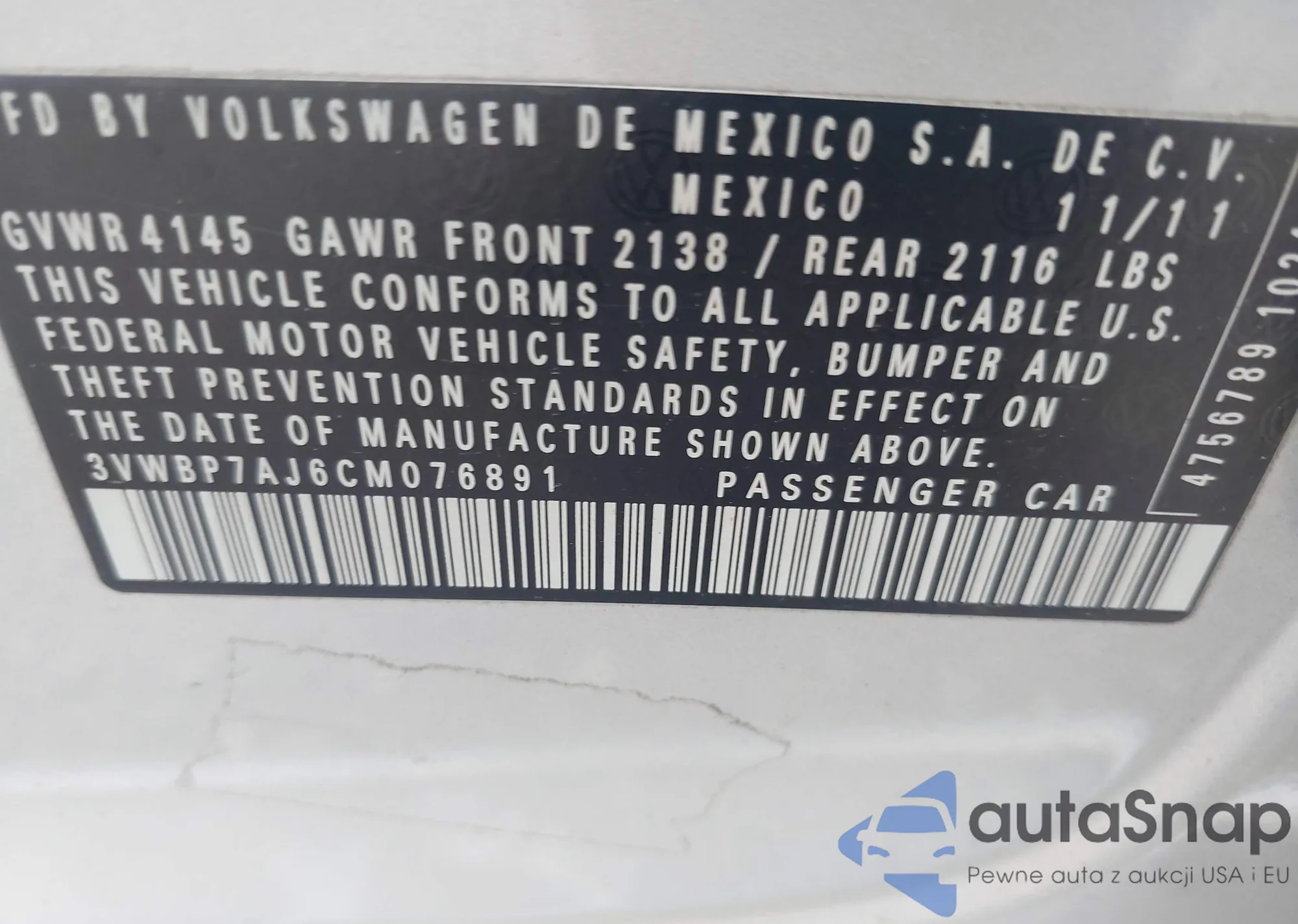 • VIN 3VWBP7AJ6CM076891