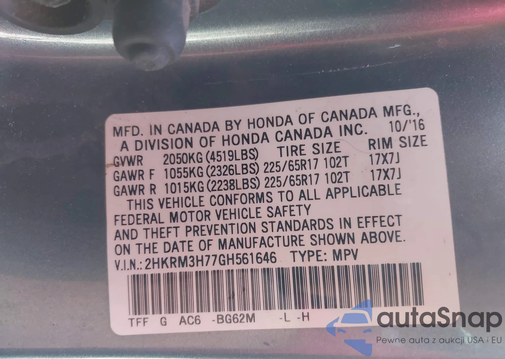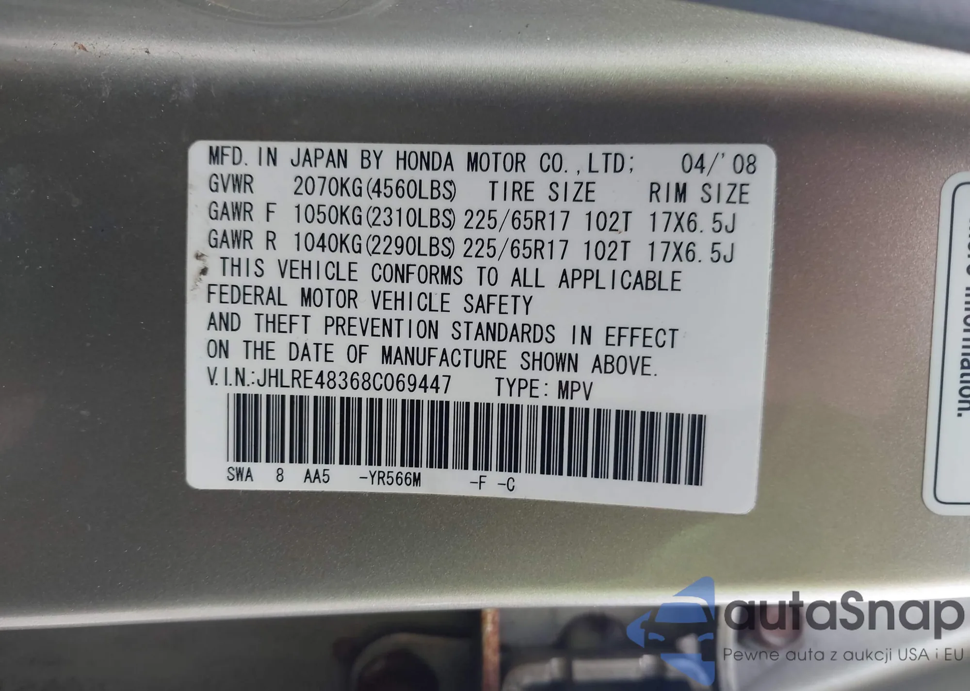 LOT: 42213970 VIN: JHLRE48368C069447