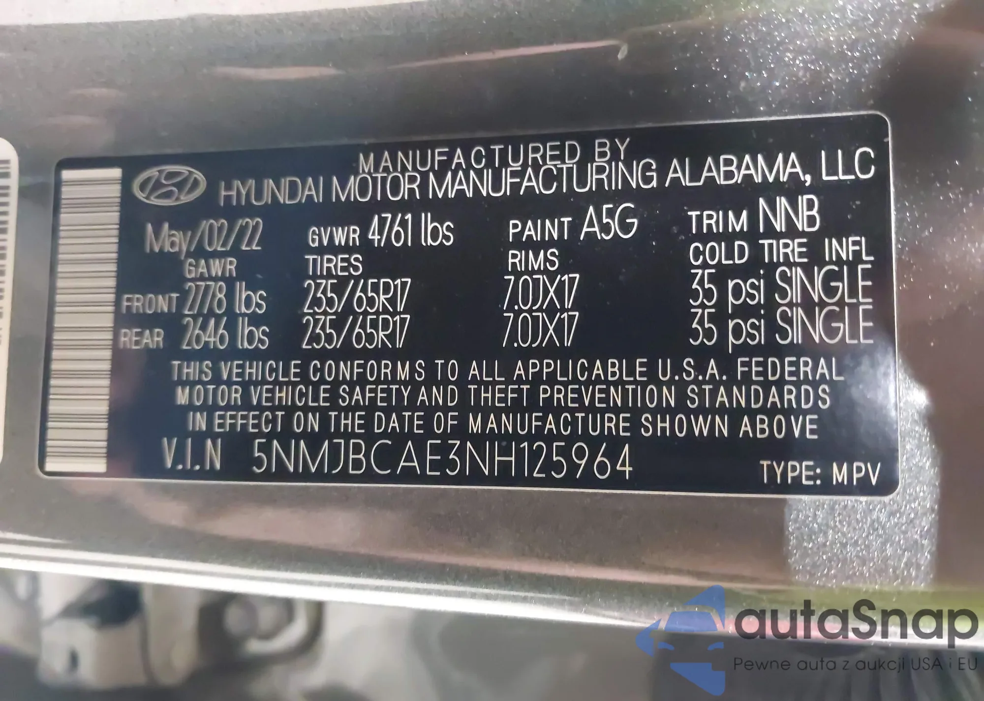 • VIN 5NMJBCAE3NH125964