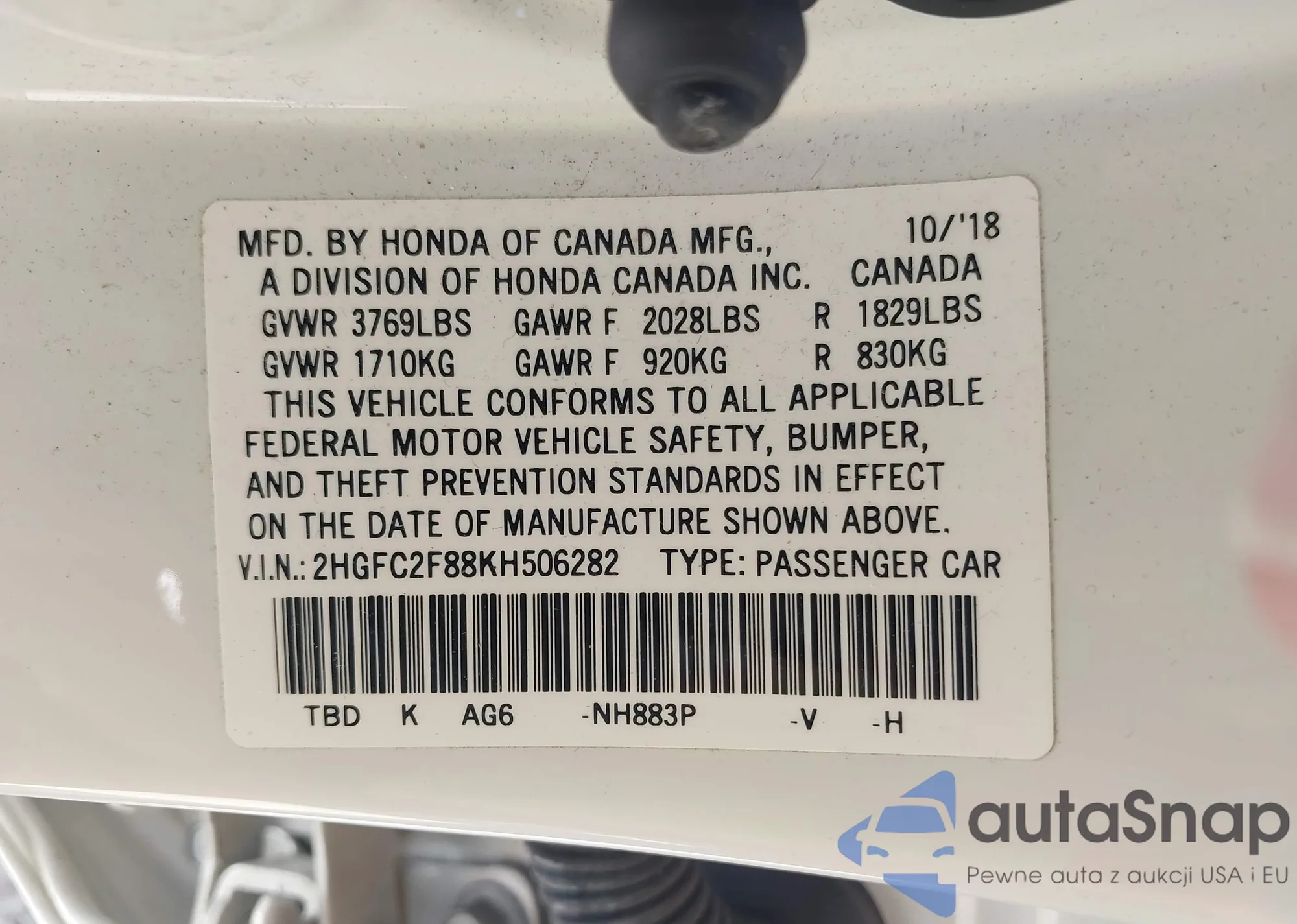 • VIN 2HGFC2F88KH506282