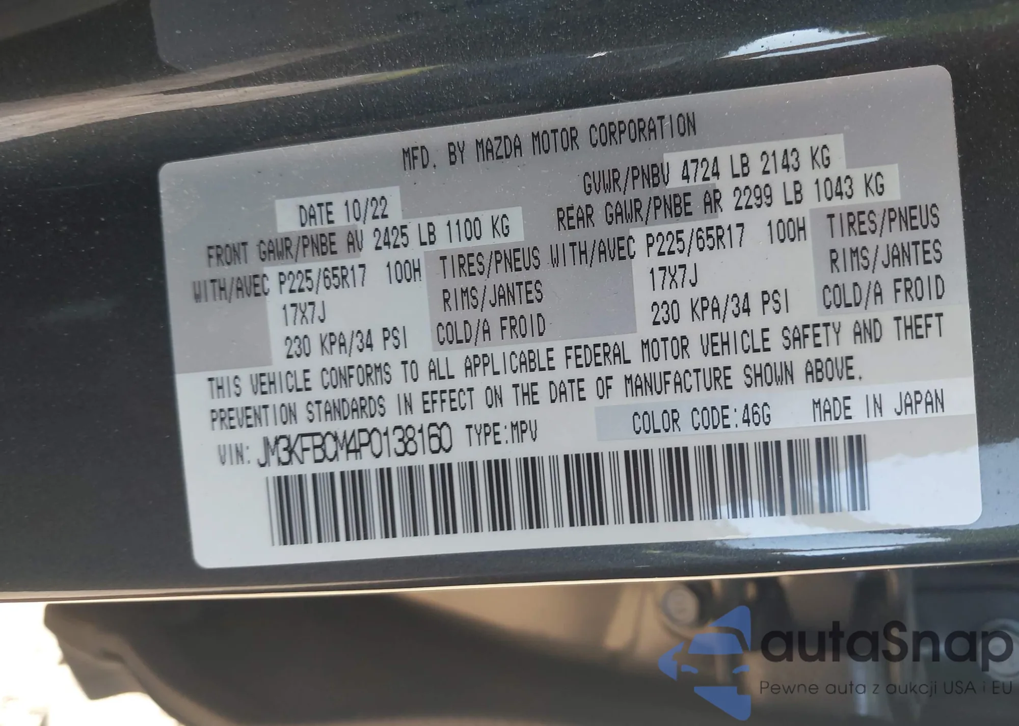 LOT: 42176185 VIN: JM3KFBCM4P0138160