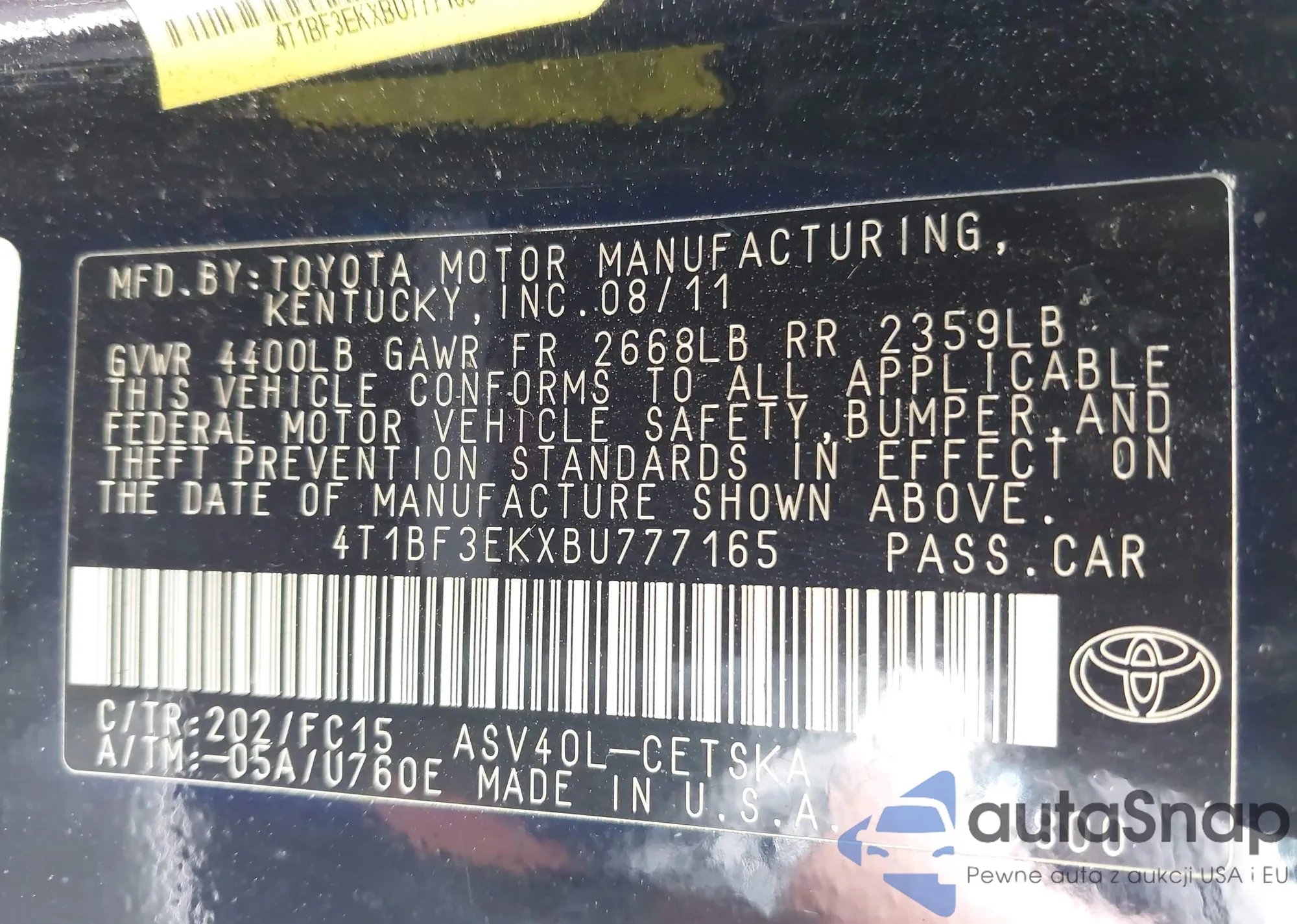 • VIN 4T1BF3EKXBU777165