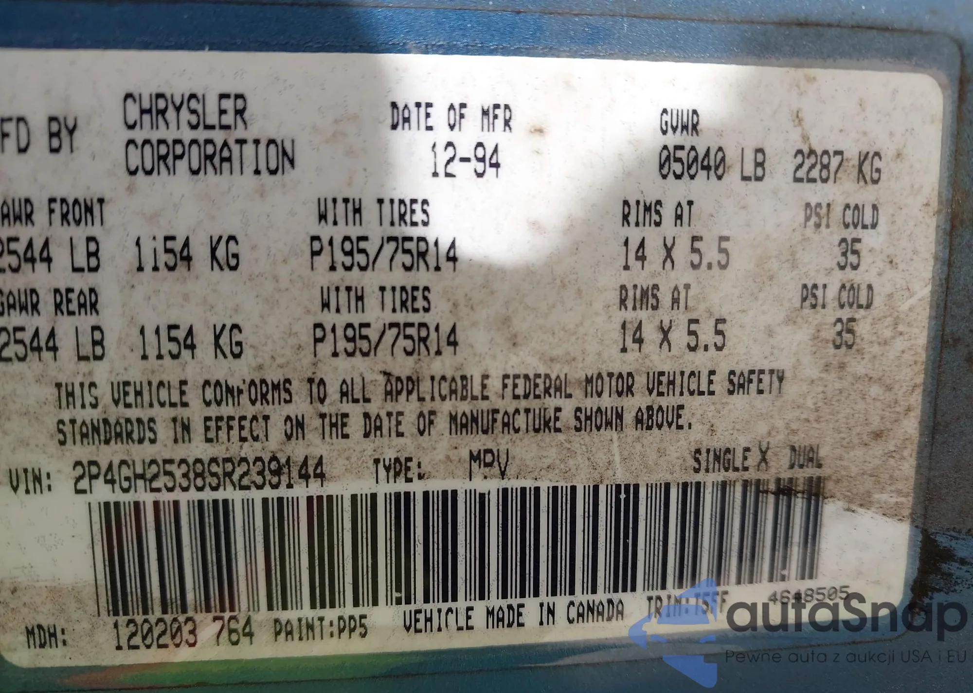 • VIN 2P4GH2538SR239144