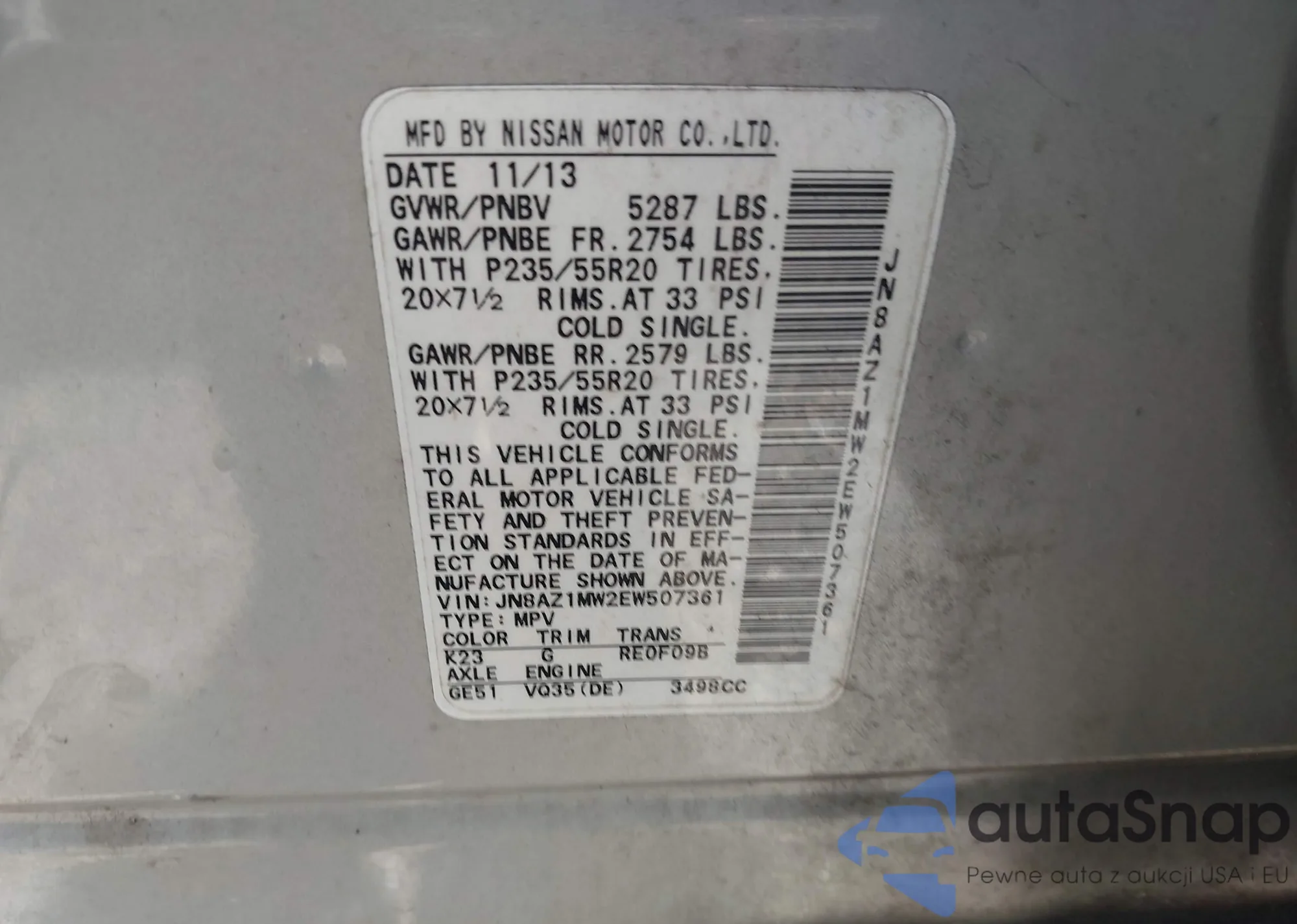 • VIN JN8AZ1MW2EW507361