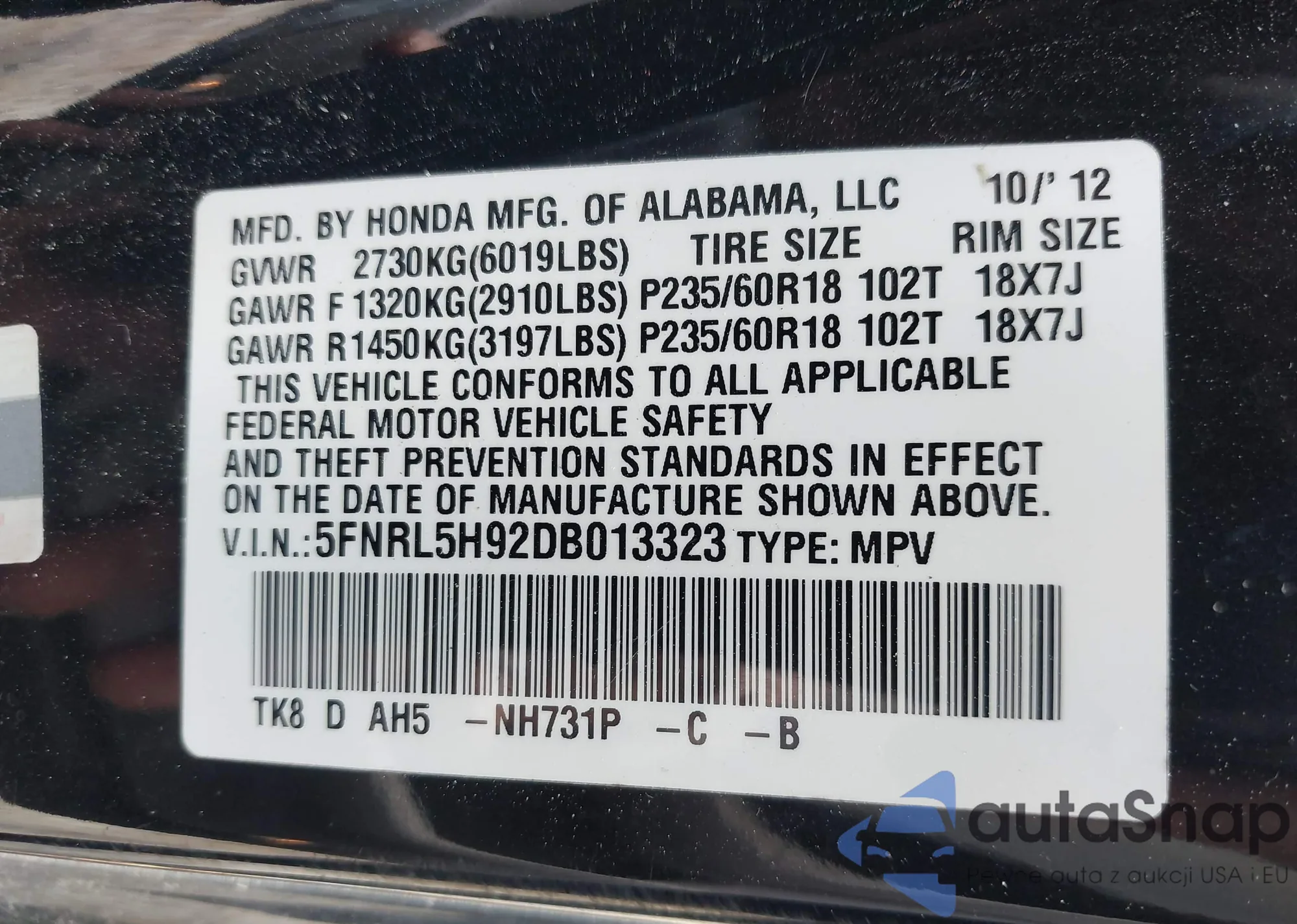 • VIN 5FNRL5H92DB013323