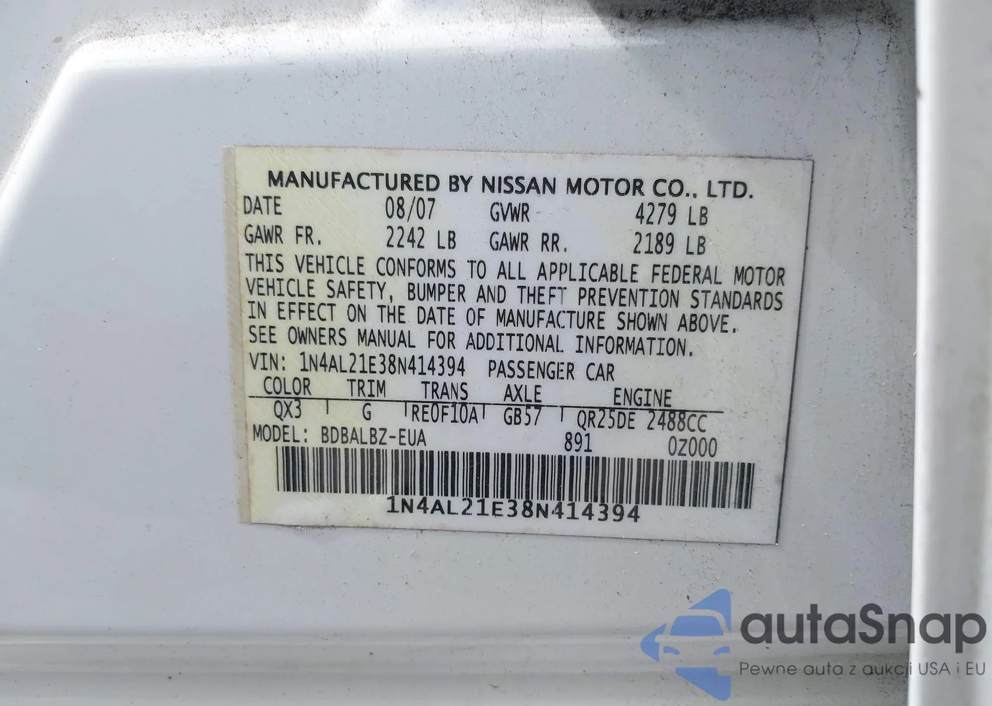 LOT: 42464342 VIN: 1N4AL21E38N414394