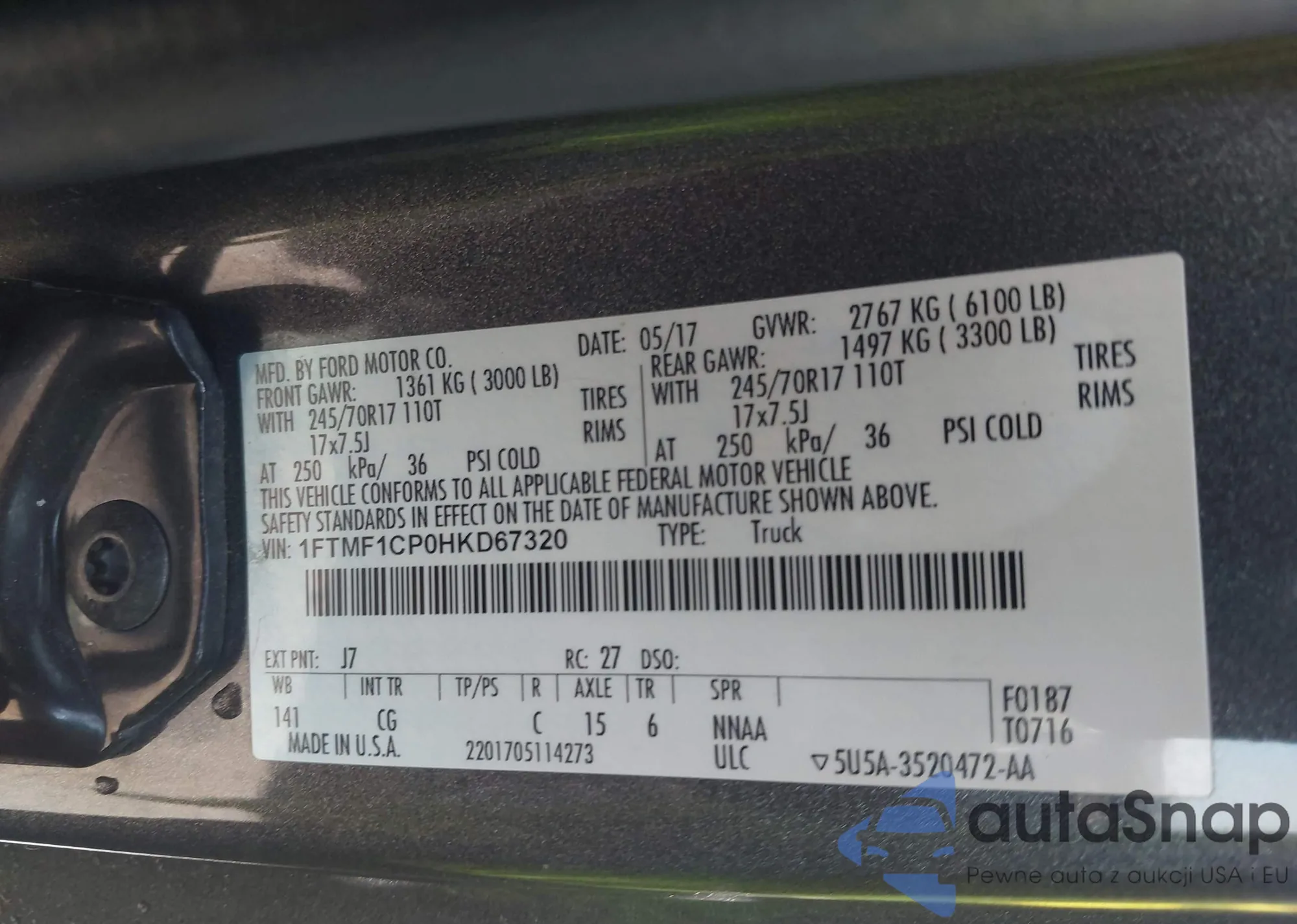 2017 Ford F-150 Xl z USA, uszkodzony, nr VIN 1FTMF1CP0HKD67320