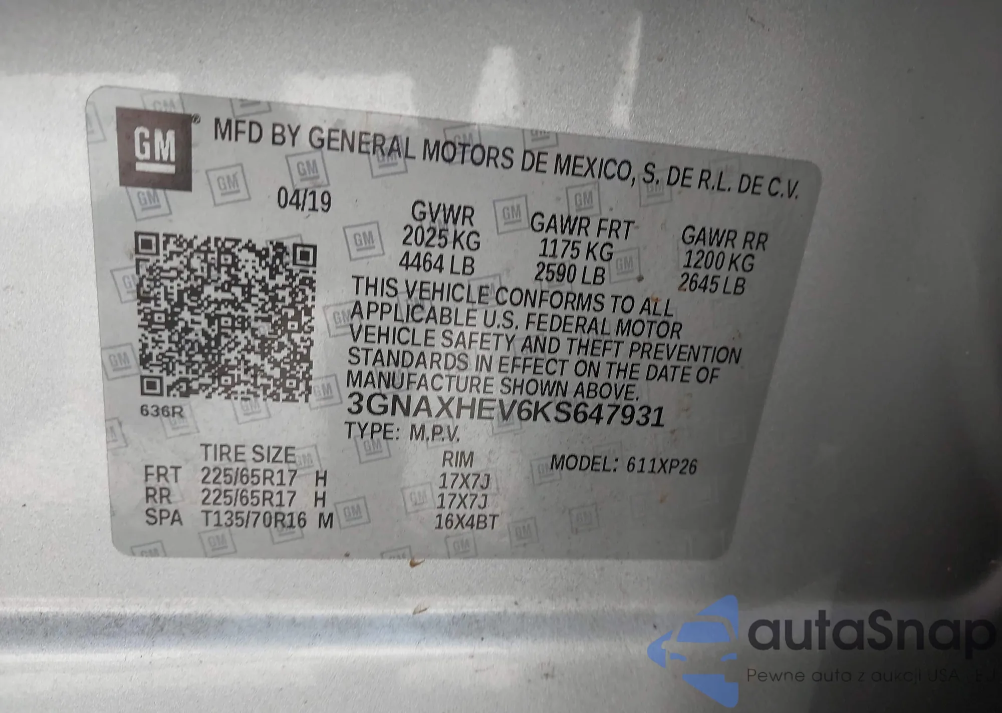 • VIN 3GNAXHEV6KS647931