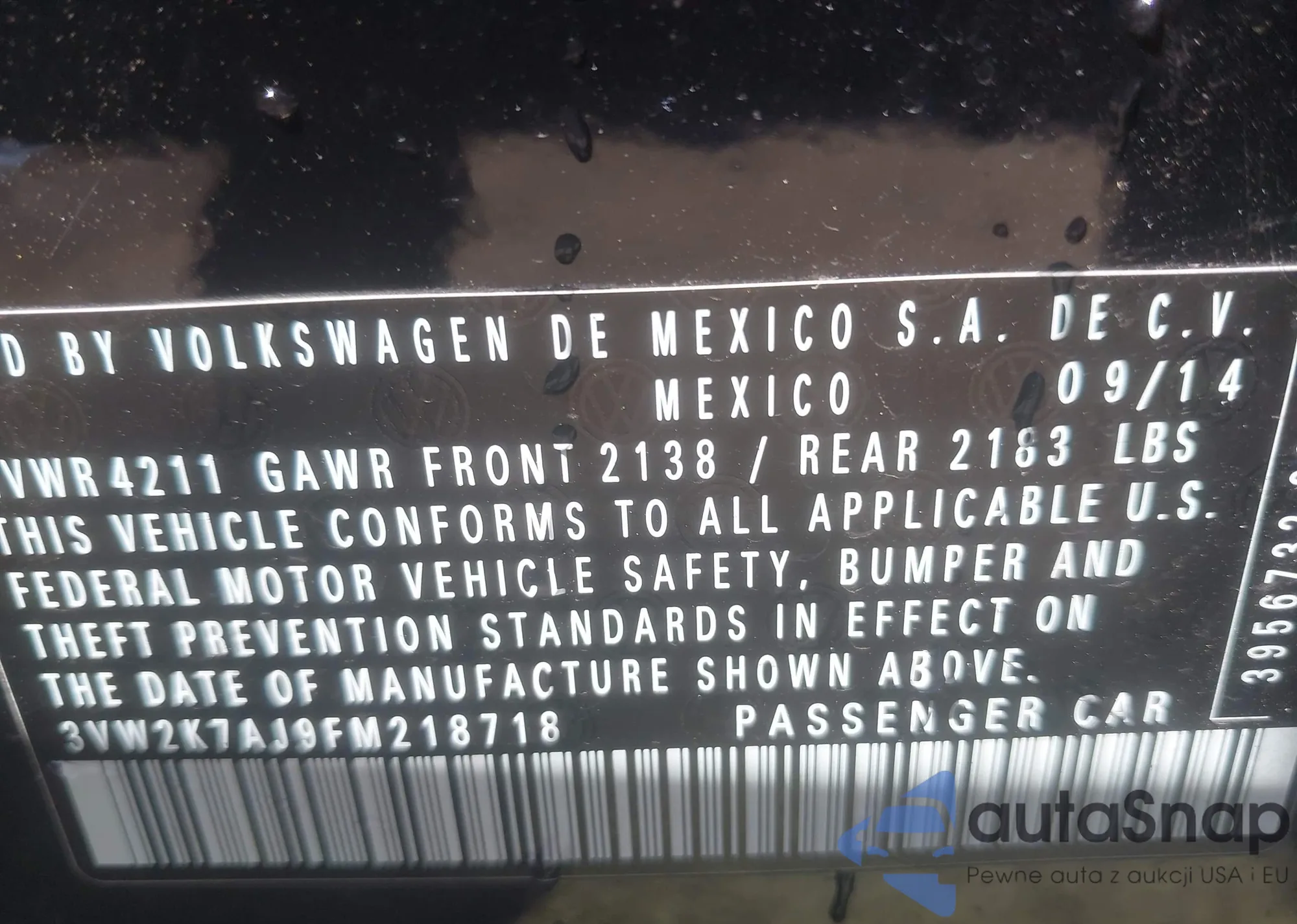 • VIN 3VW2K7AJ9FM218718
