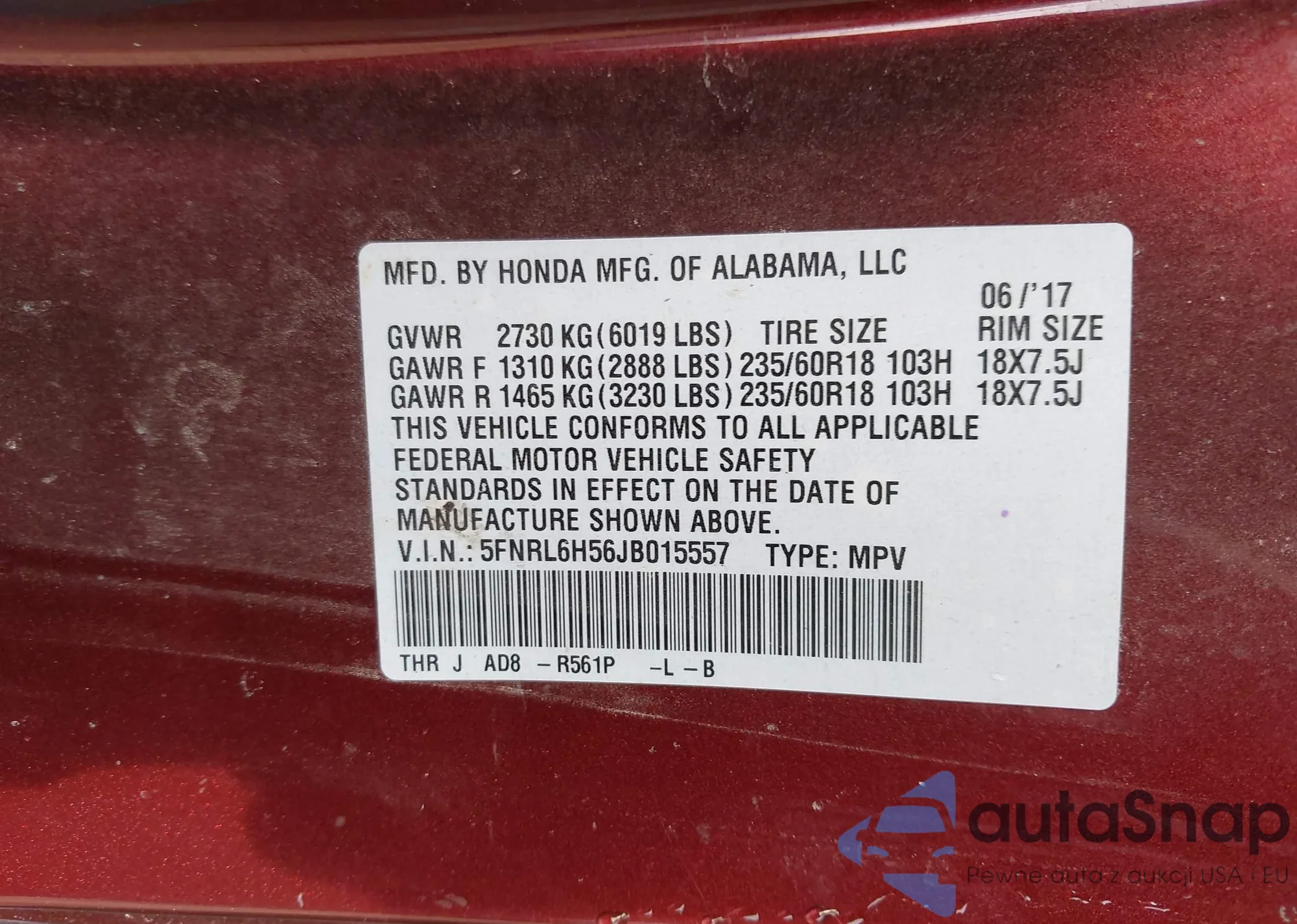 LOT: 42112667 VIN: 5FNRL6H56JB015557