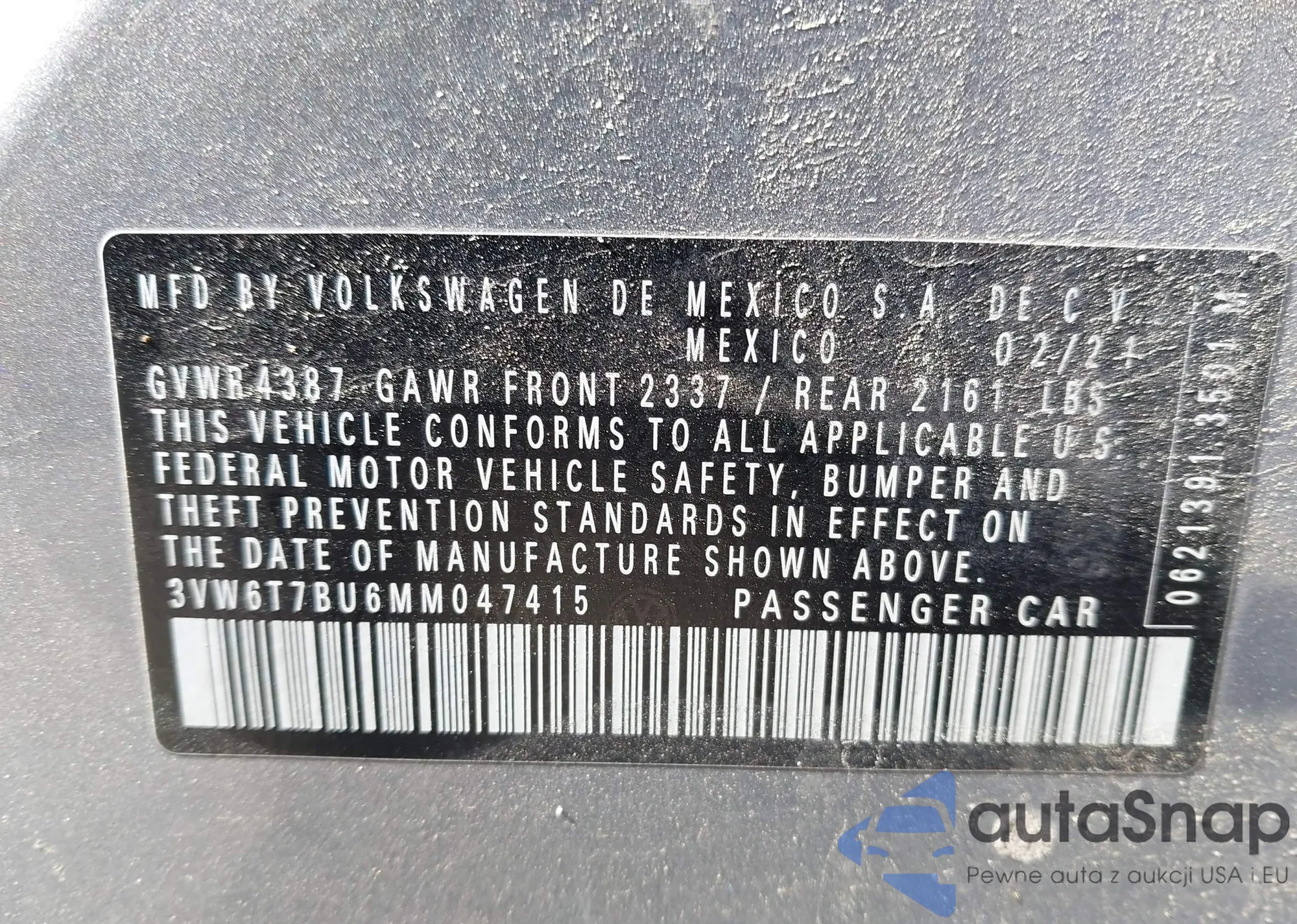 • VIN 3VW6T7BU6MM047415