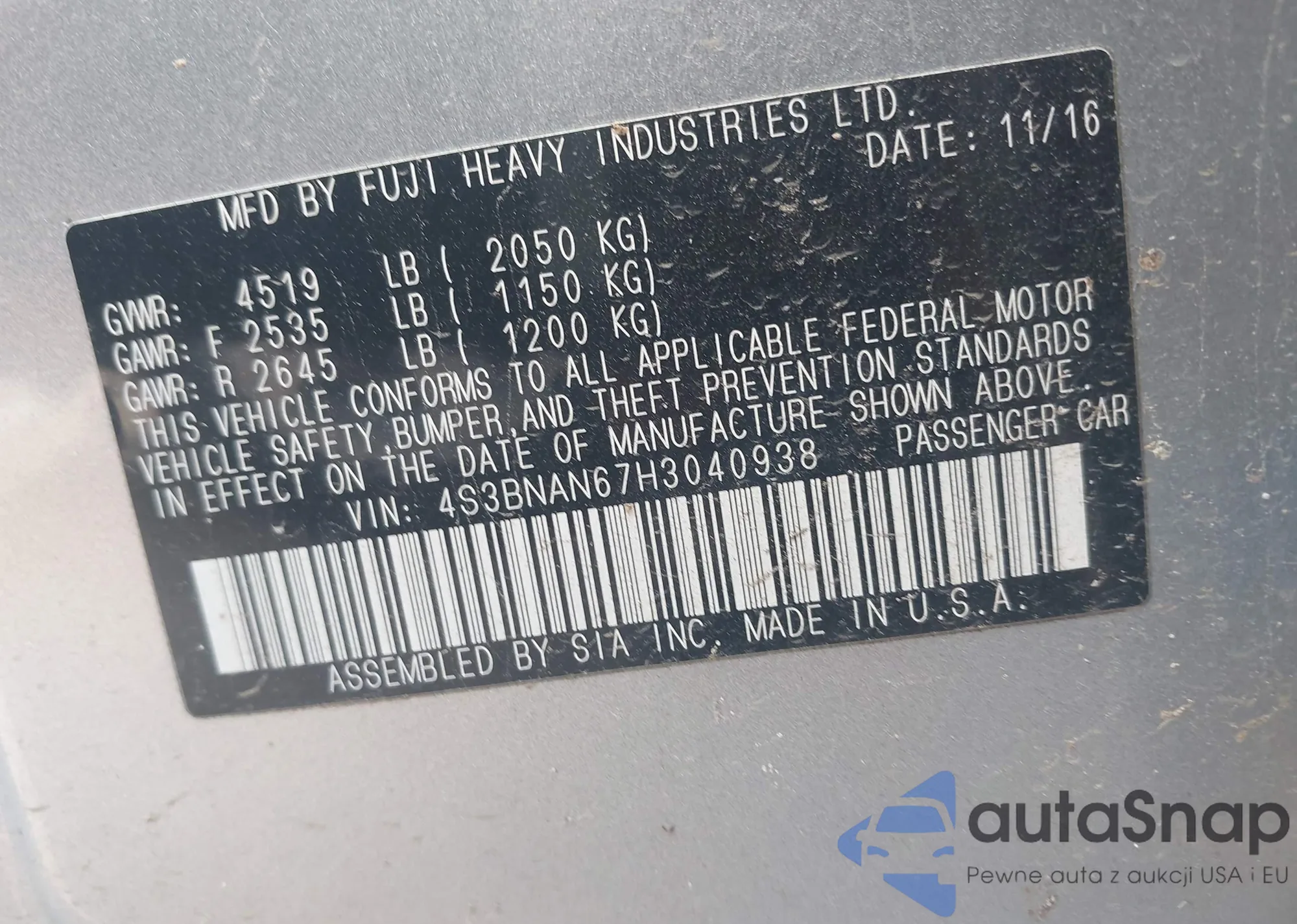 LOT: 42396552 VIN: 4S3BNAN67H3040938