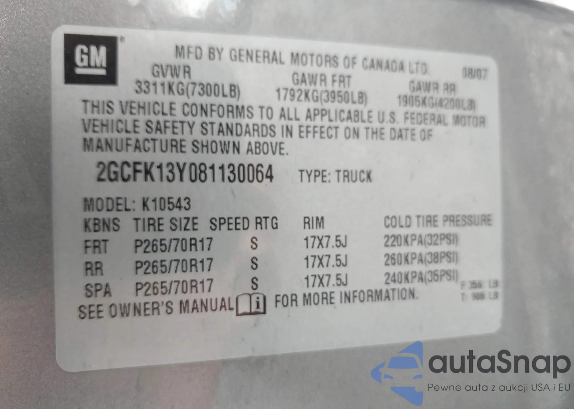 • VIN 2GCFK13Y081130064