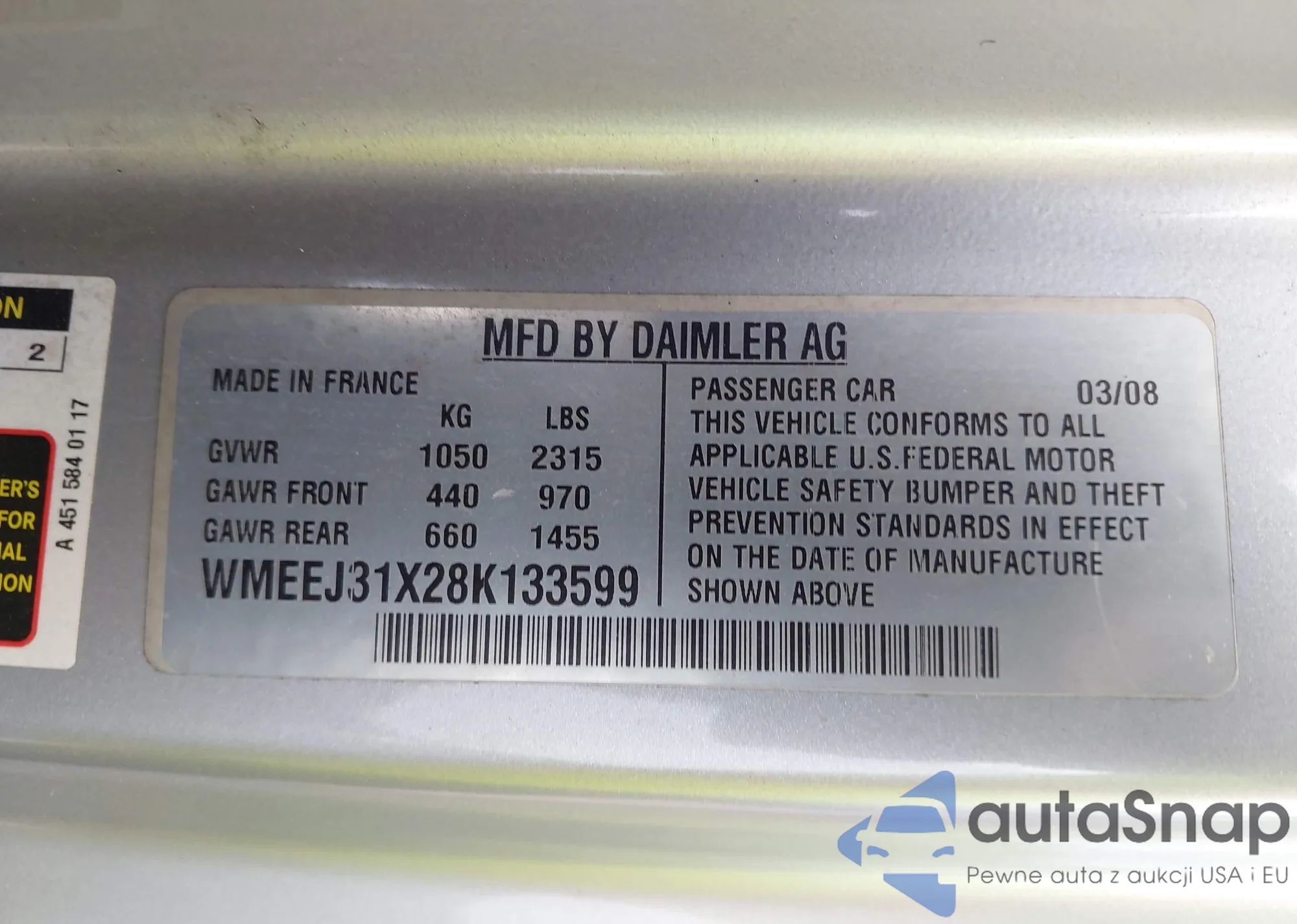 LOT: 42522306 VIN: WMEEJ31X28K133599