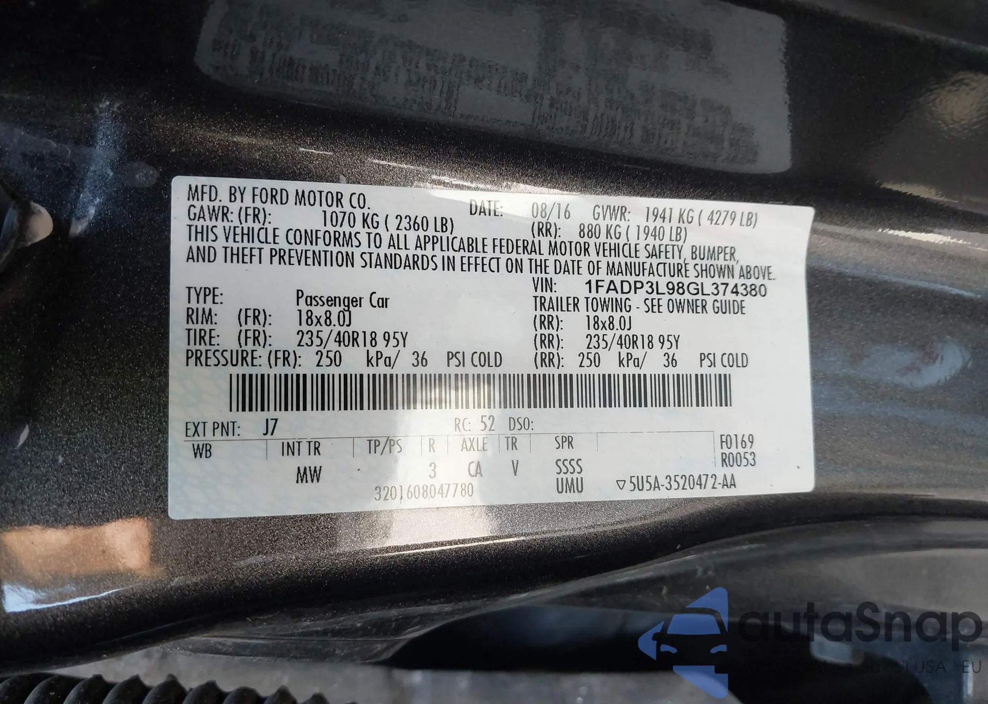• VIN 1FADP3L98GL374380