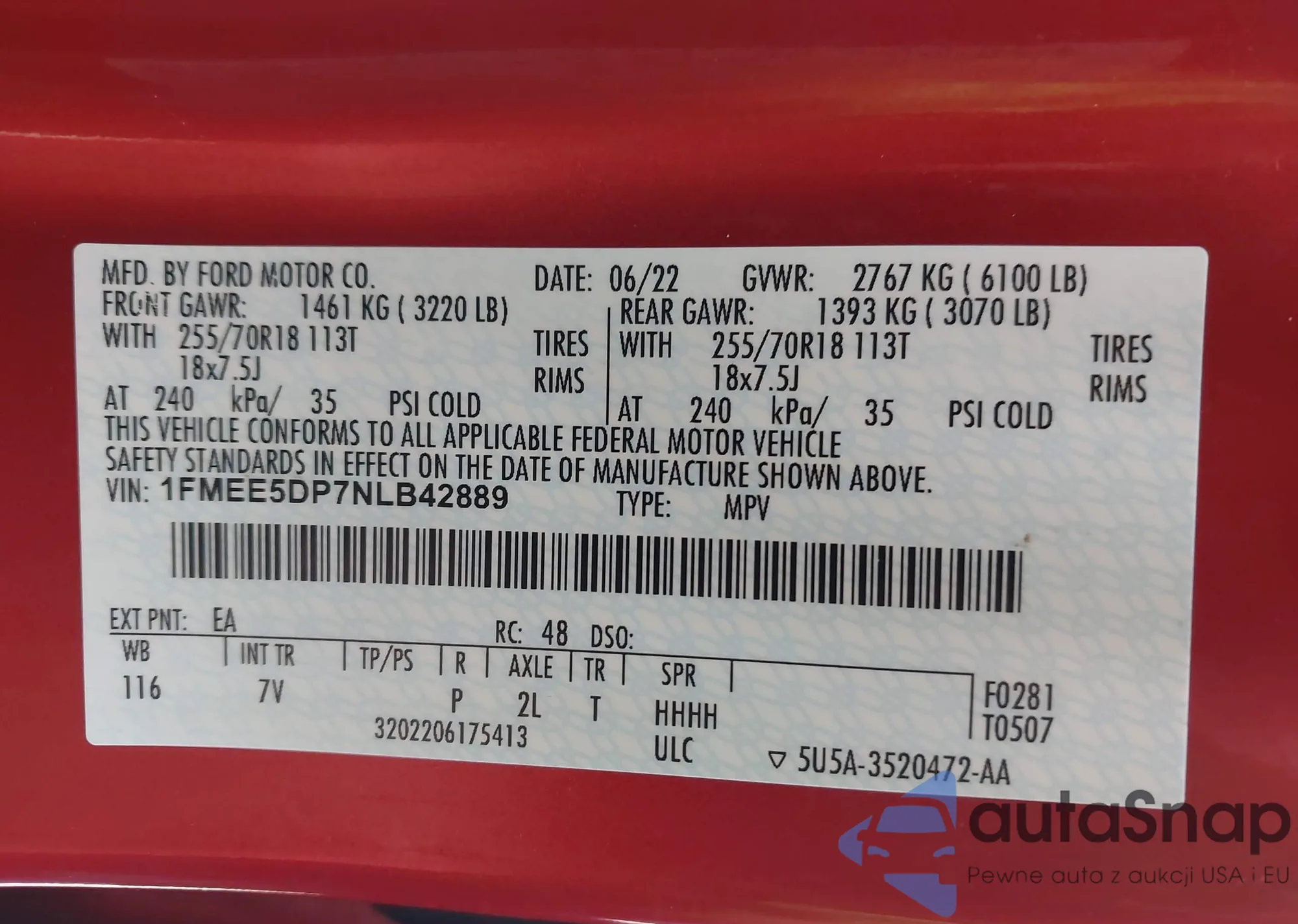 LOT: 42503882 VIN: 1FMEE5DP7NLB42889