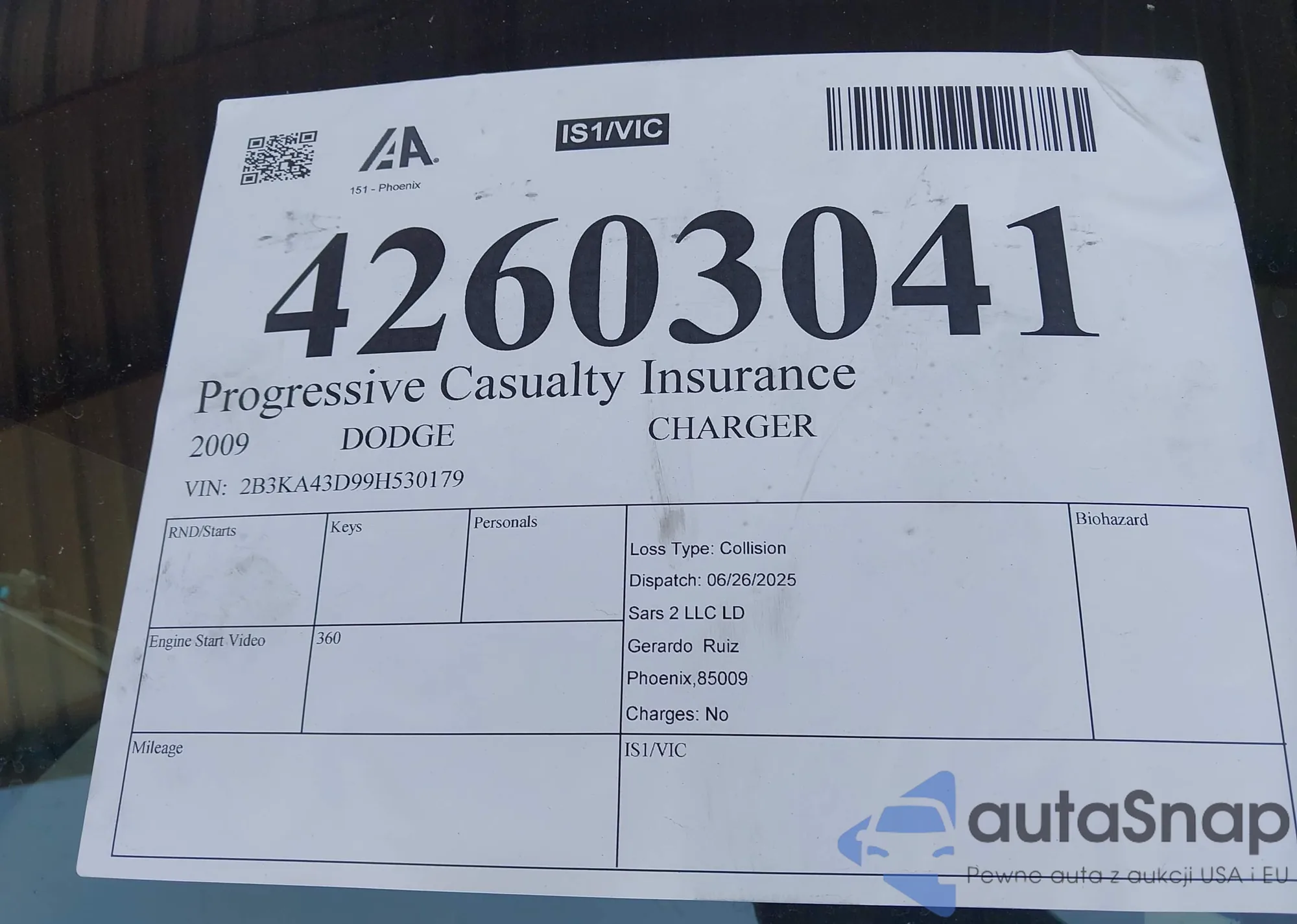 LOT: 42603041 VIN: 2B3KA43D99H530179