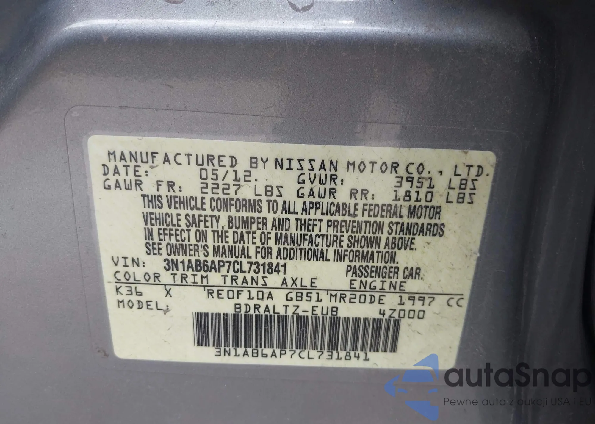 LOT: 42610882 VIN: 3N1AB6AP7CL731841