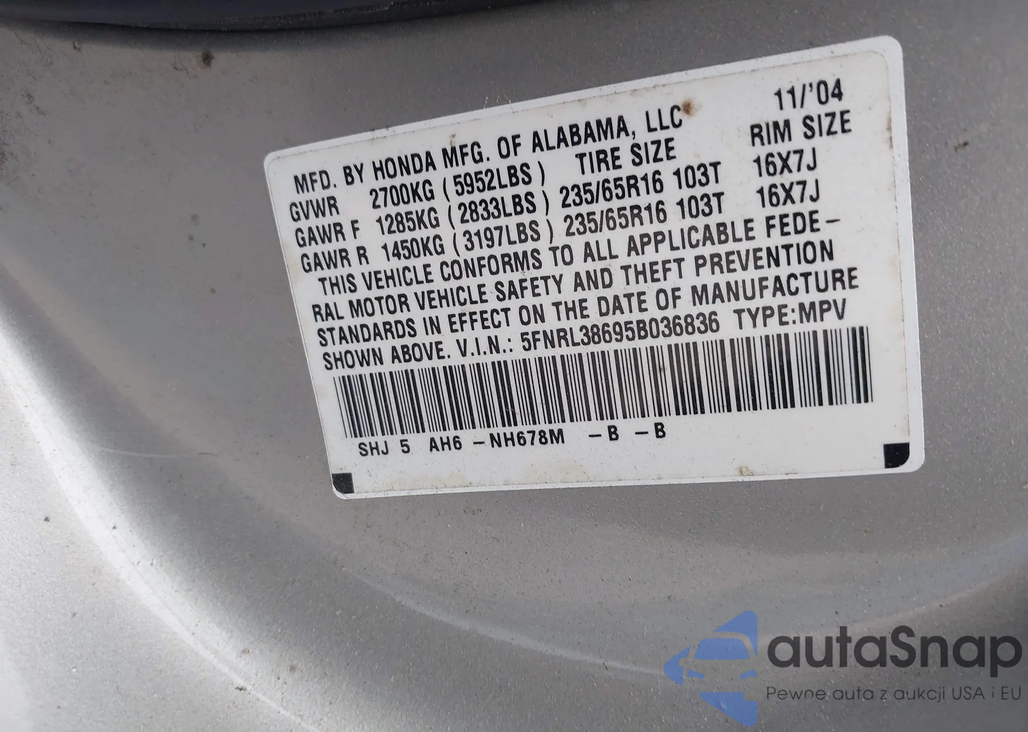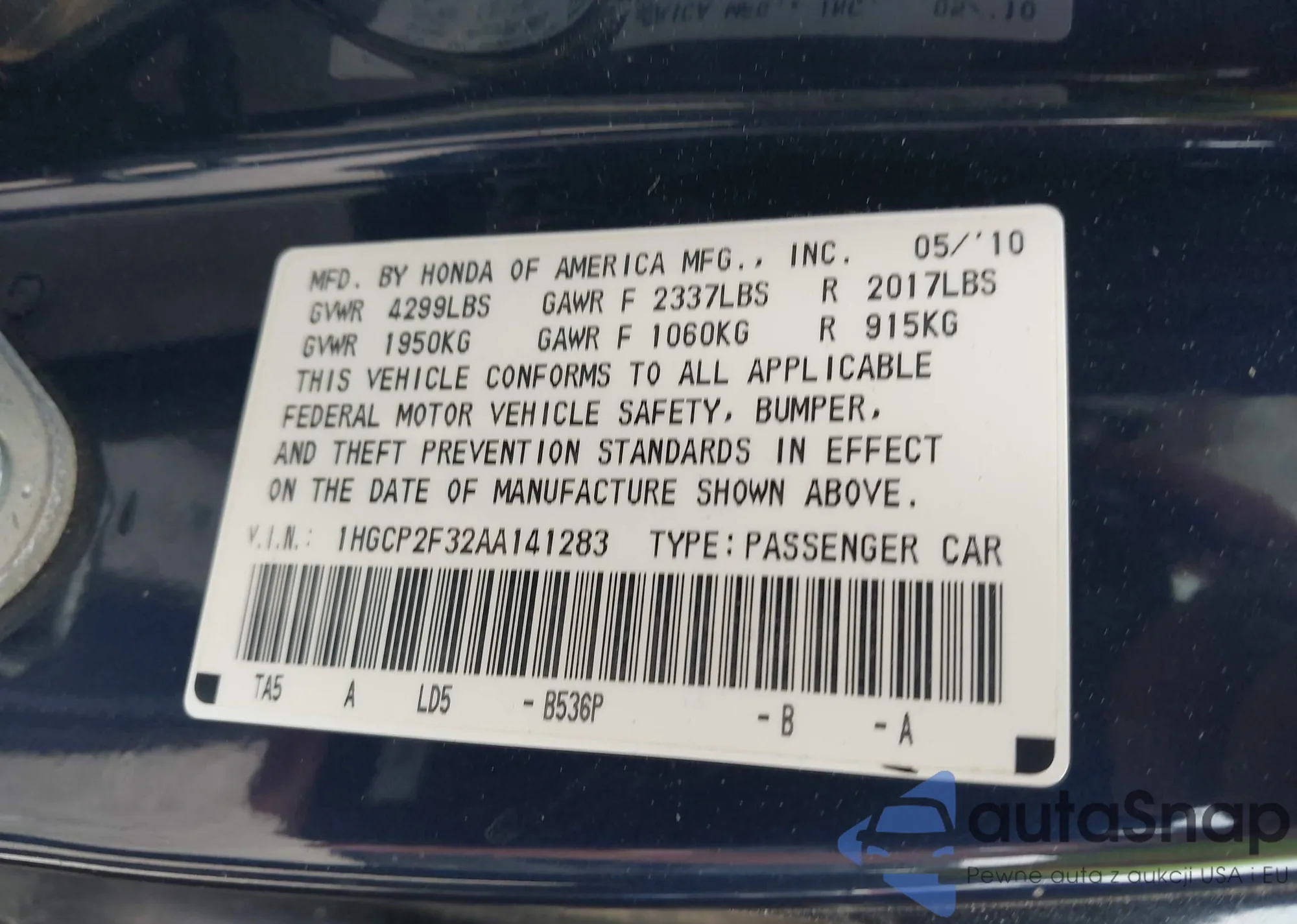 LOT: 42300792 VIN: 1HGCP2F32AA141283