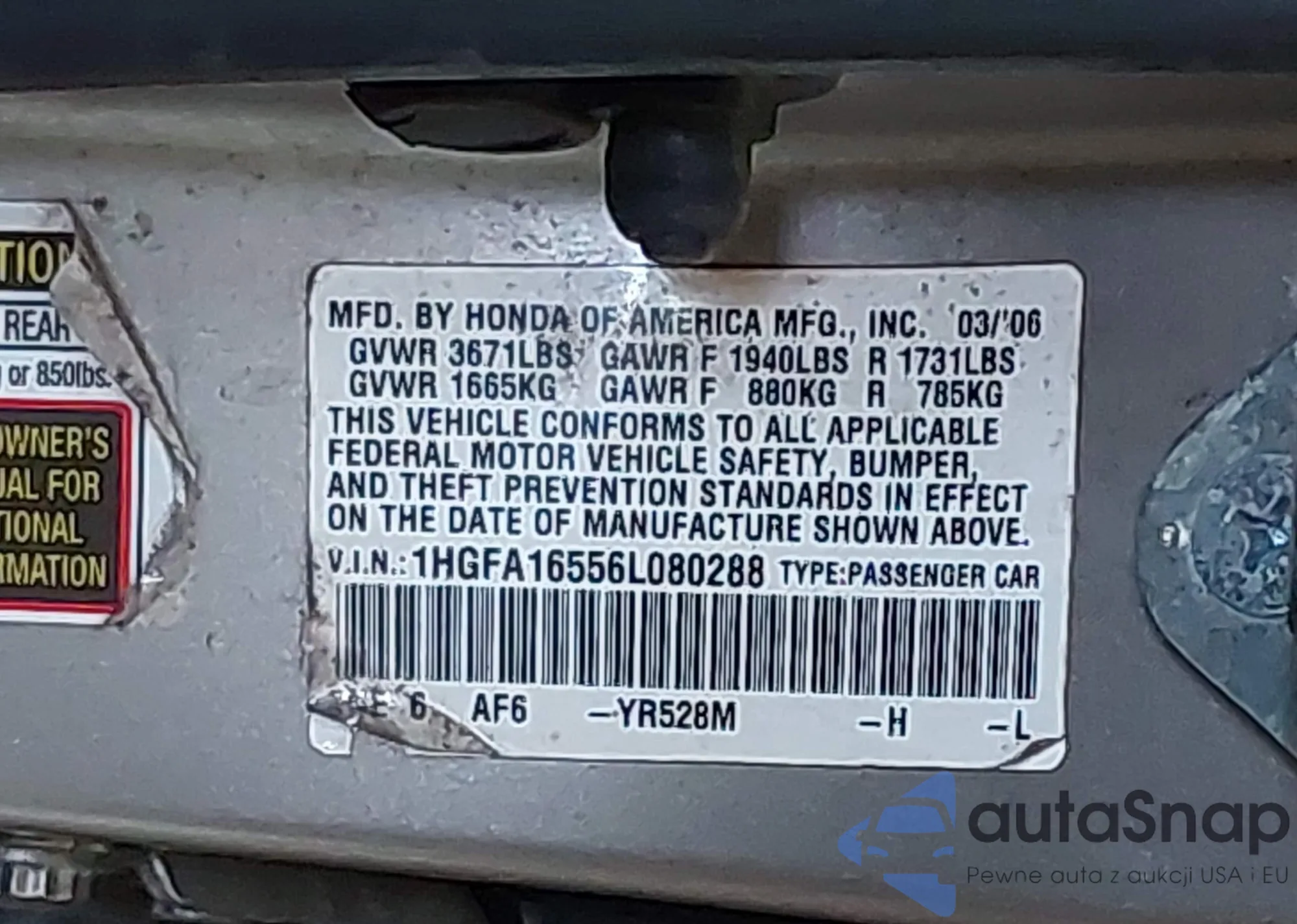 LOT: 42417079 VIN: 1HGFA16556L080288