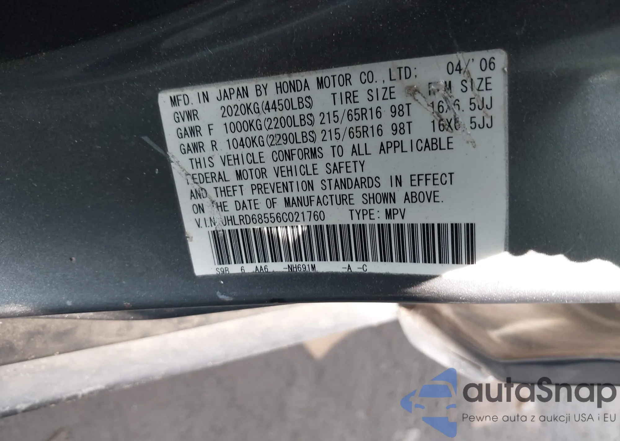 • VIN JHLRD68556C021760