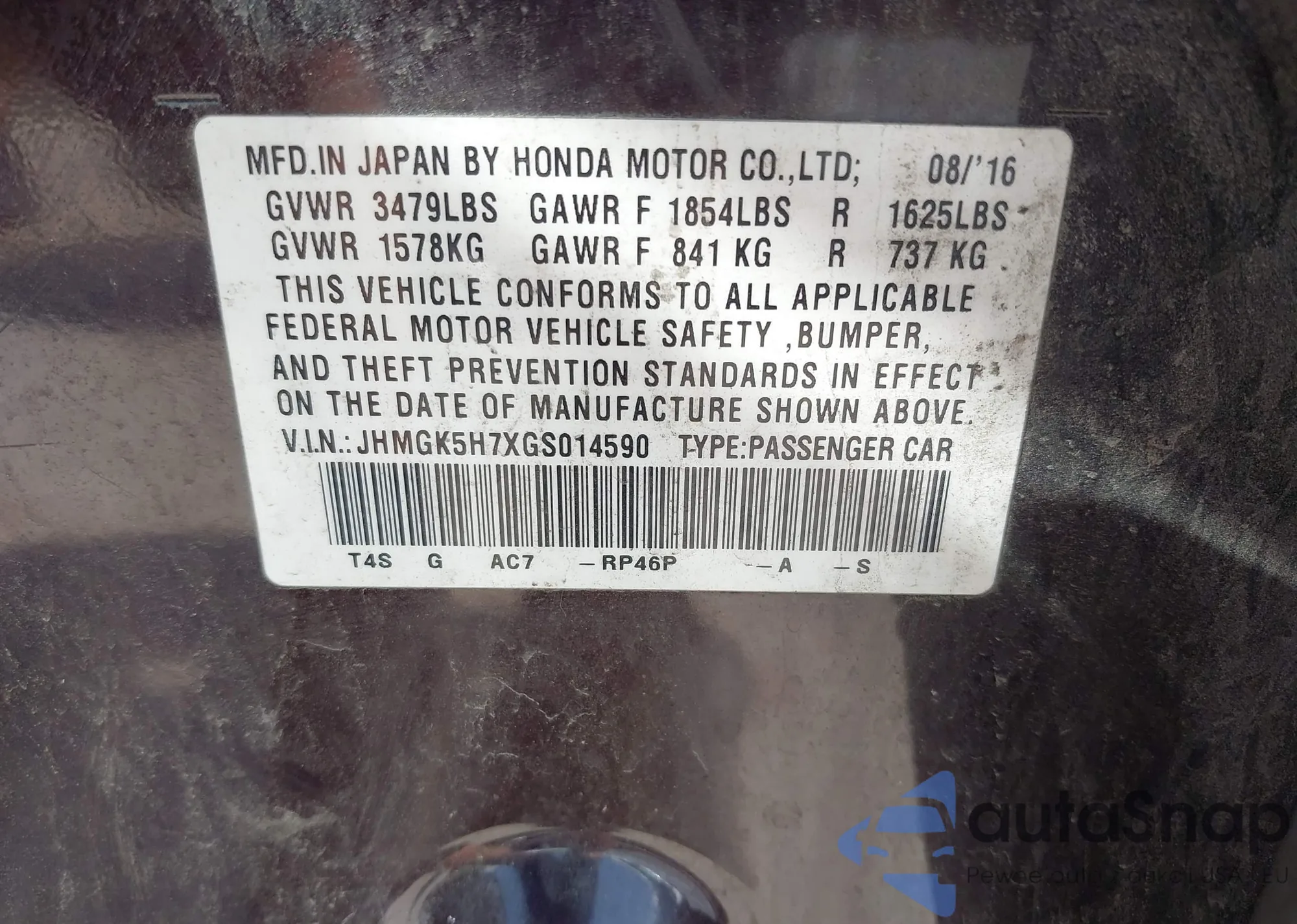 LOT: 42379370 VIN: JHMGK5H7XGS014590