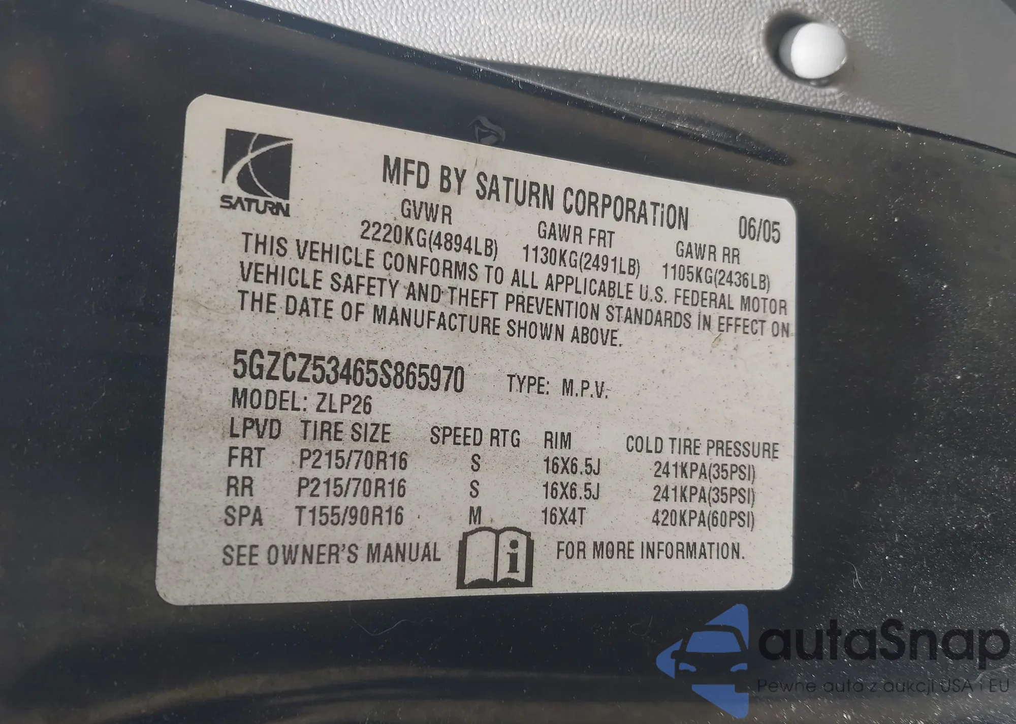 2005 Saturn Vue V6 z USA, uszkodzony, nr VIN 5GZCZ53465S865970
