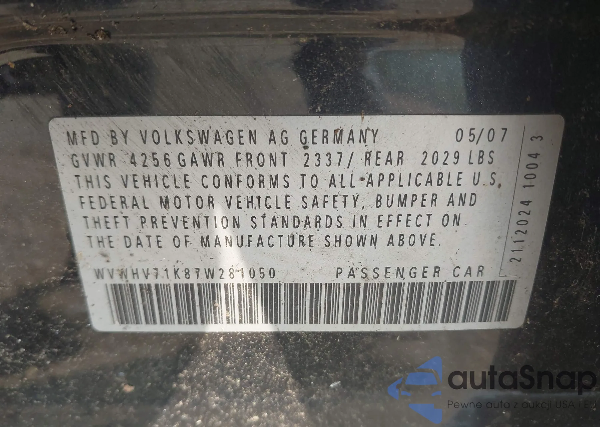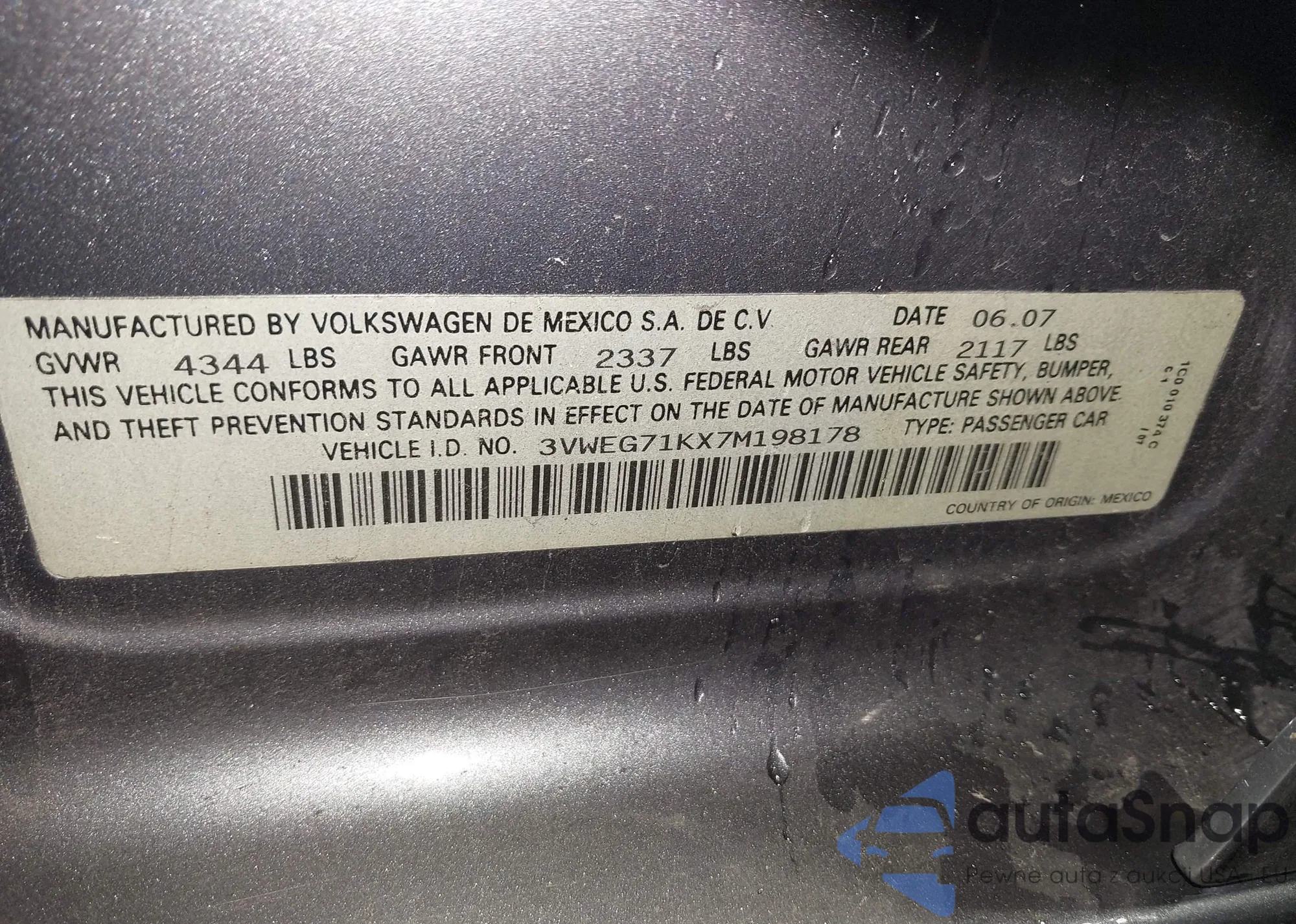 • VIN 3VWEG71KX7M198178