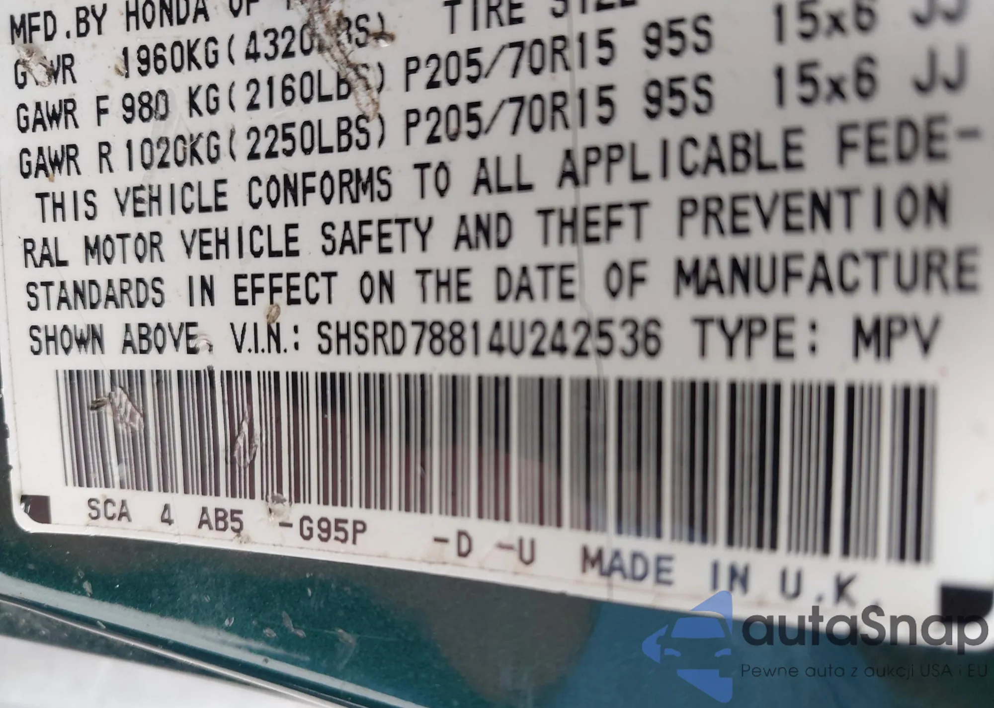 • VIN SHSRD78814U242536
