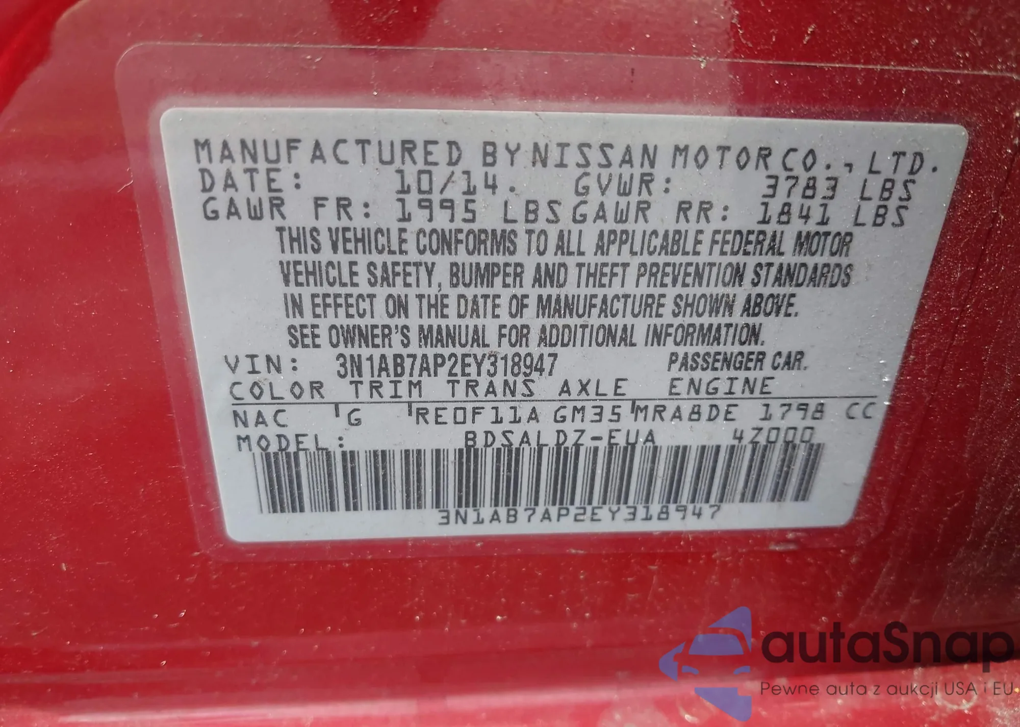 LOT: 42475772 VIN: 3N1AB7AP2EY318947