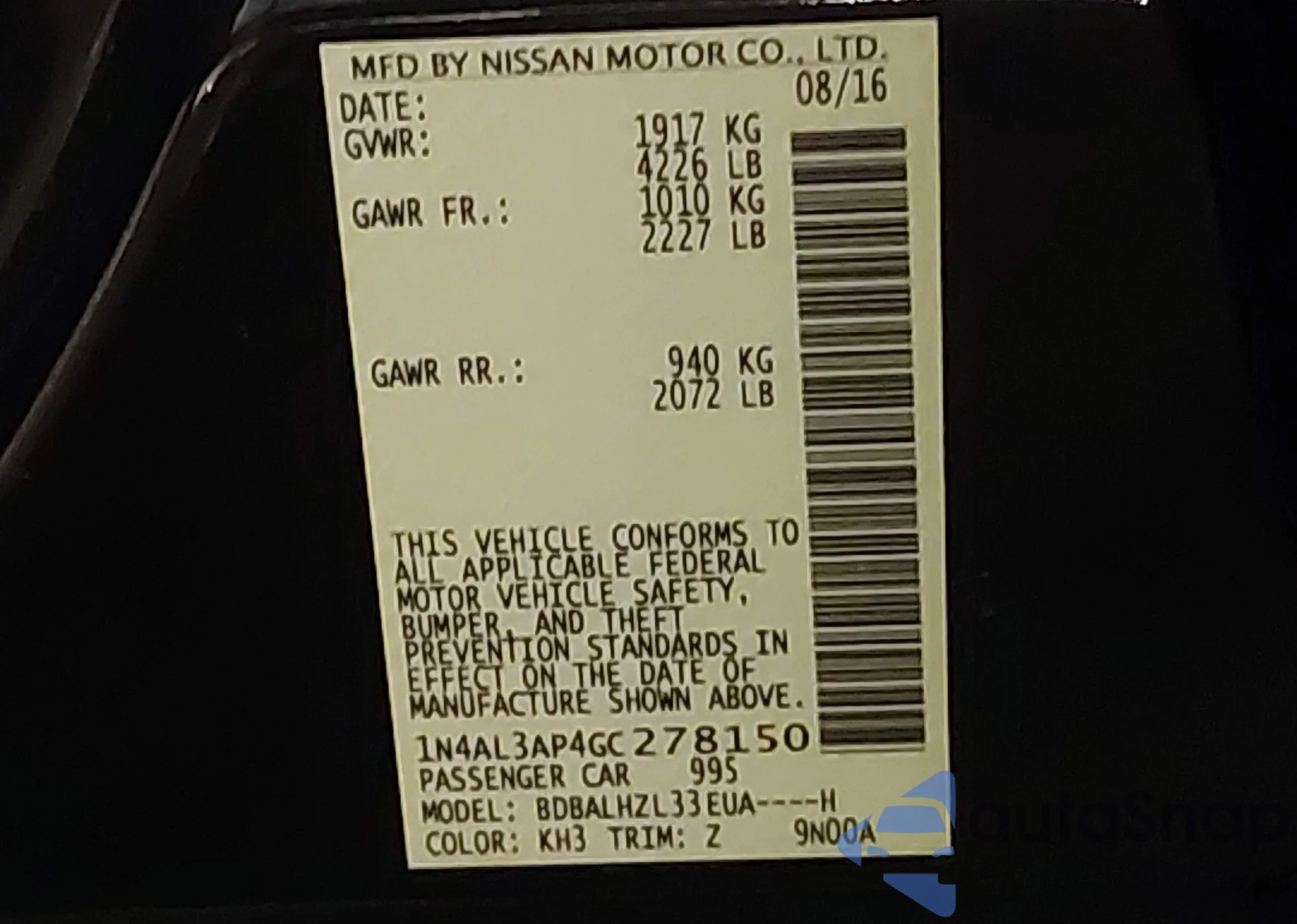 LOT: 42576444 VIN: 1N4AL3AP4GC278150