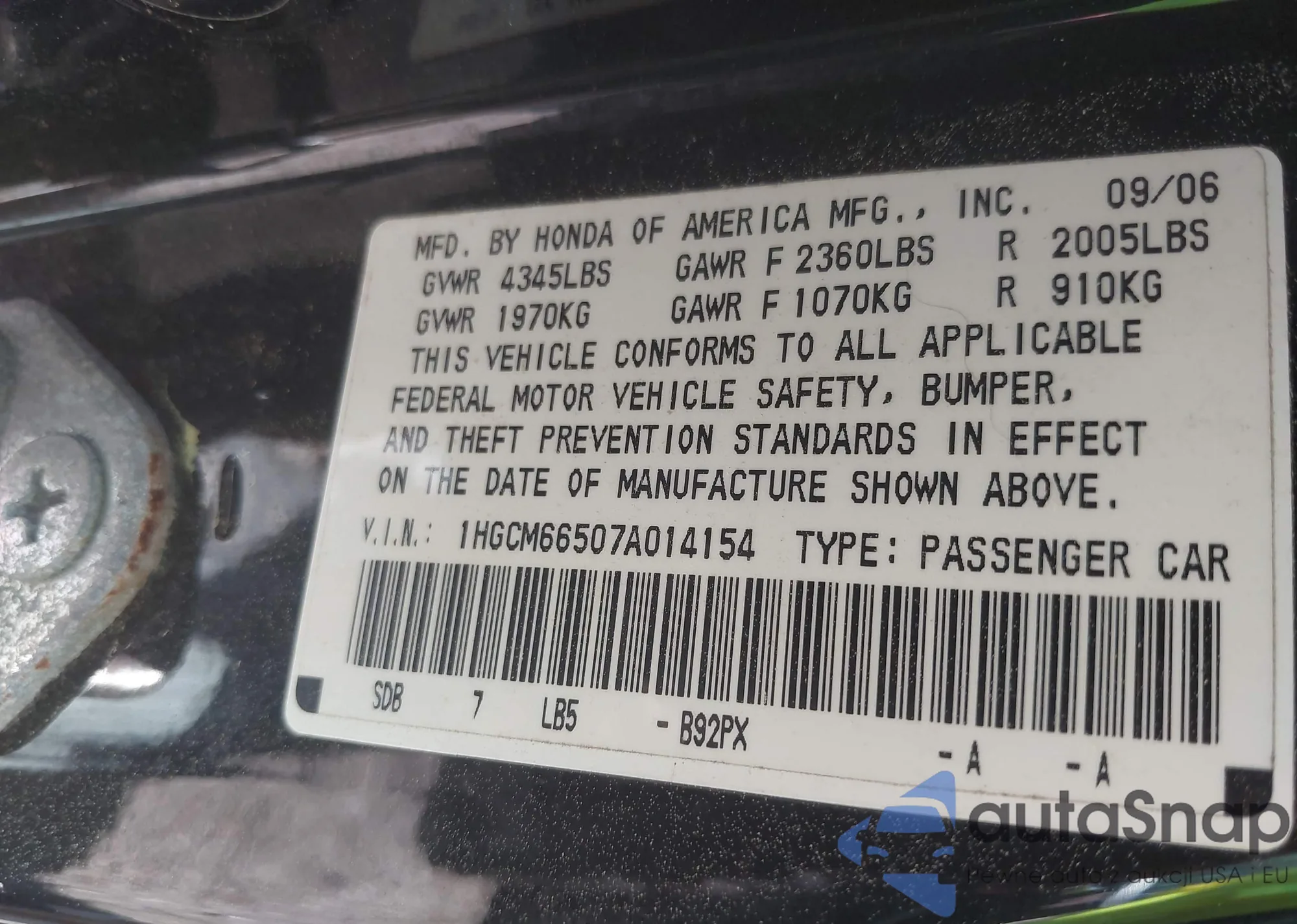 LOT: 42578973 VIN: 1HGCM66507A014154