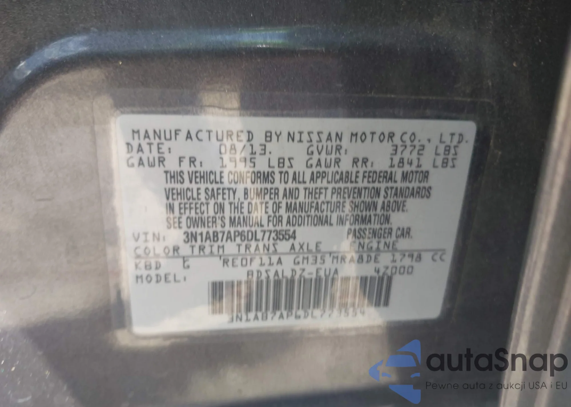 LOT: 42520478 VIN: 3N1AB7AP6DL773554