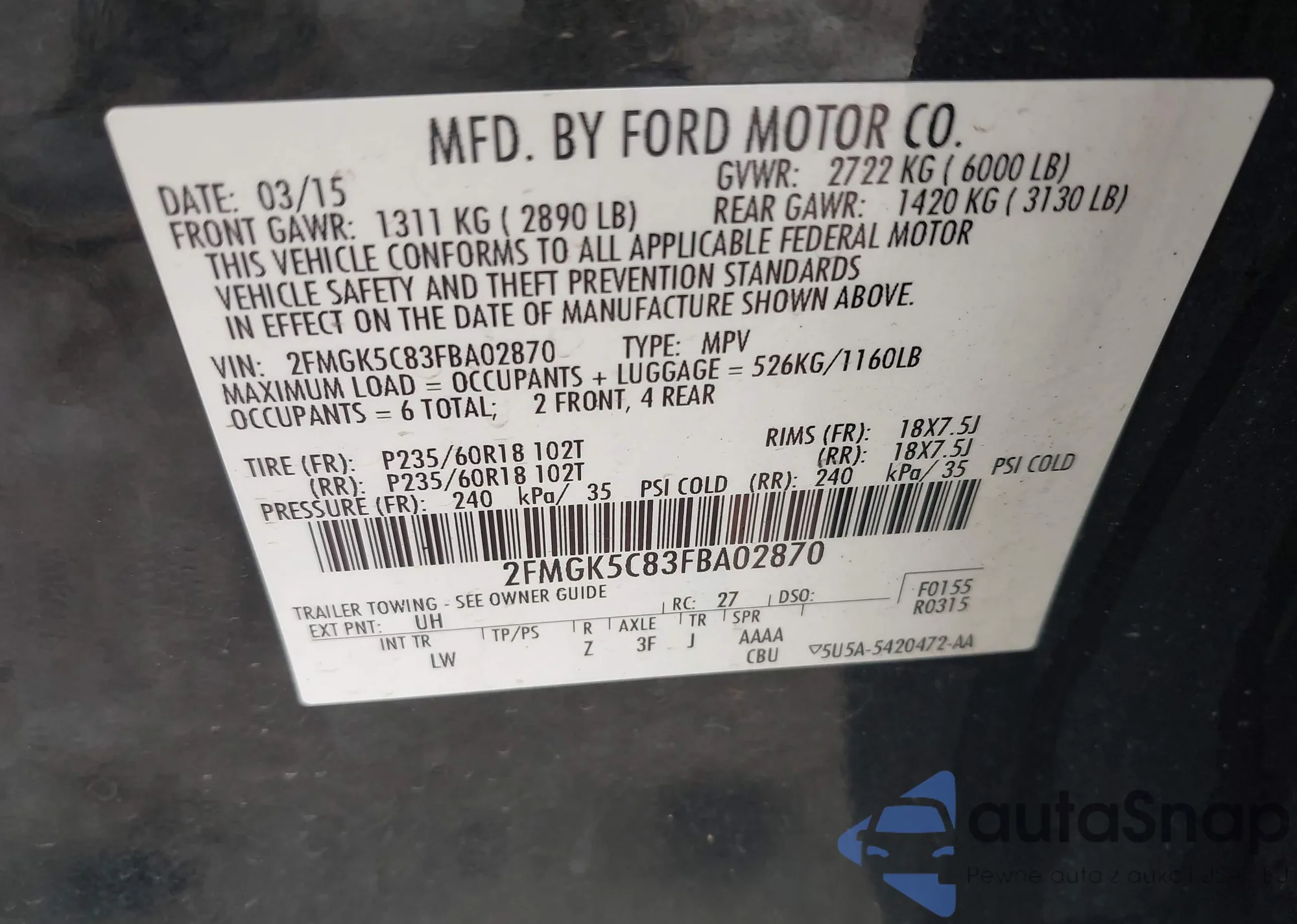 LOT: 42436933 VIN: 2FMGK5C83FBA02870
