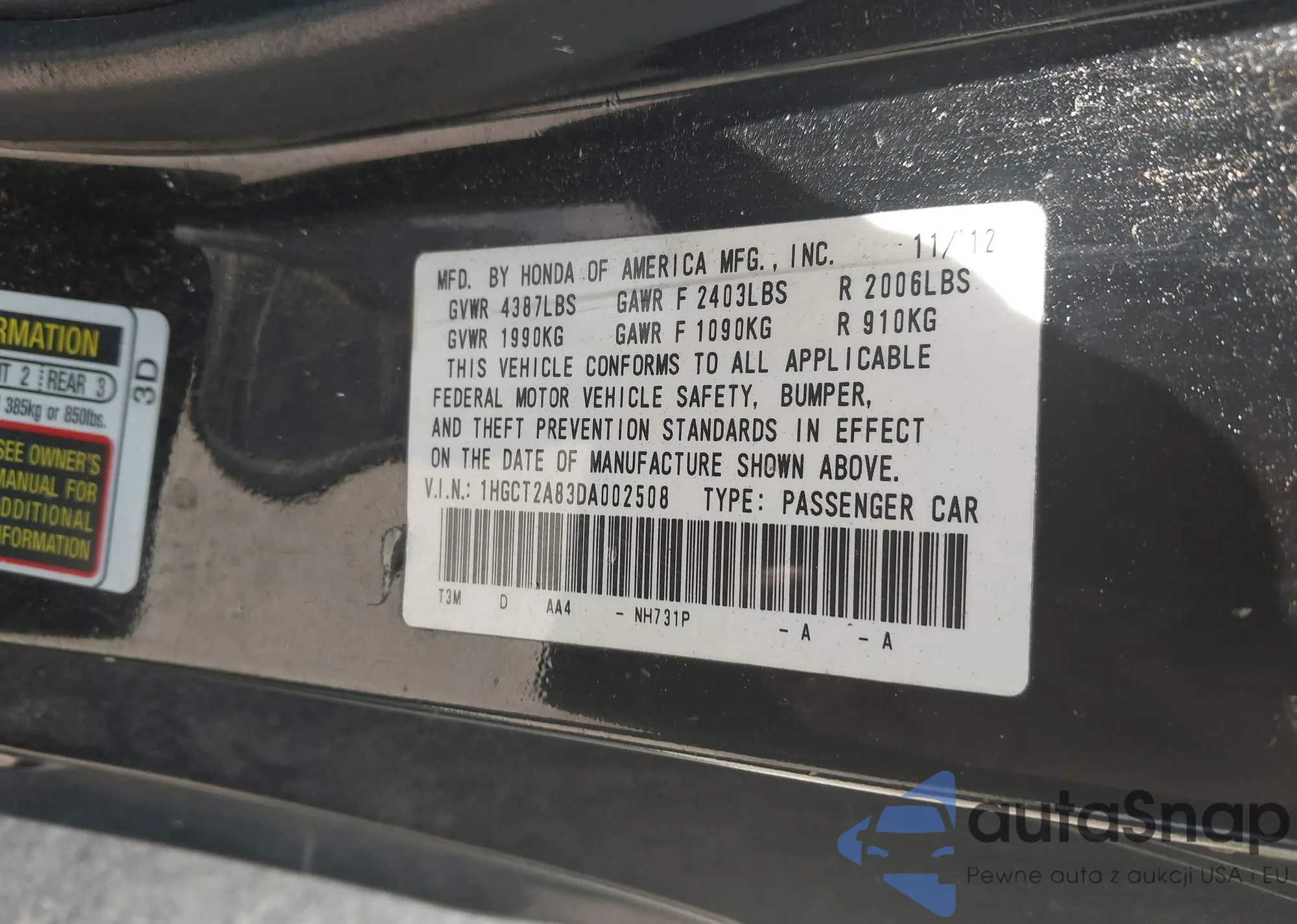 LOT: 42566425 VIN: 1HGCT2A83DA002508