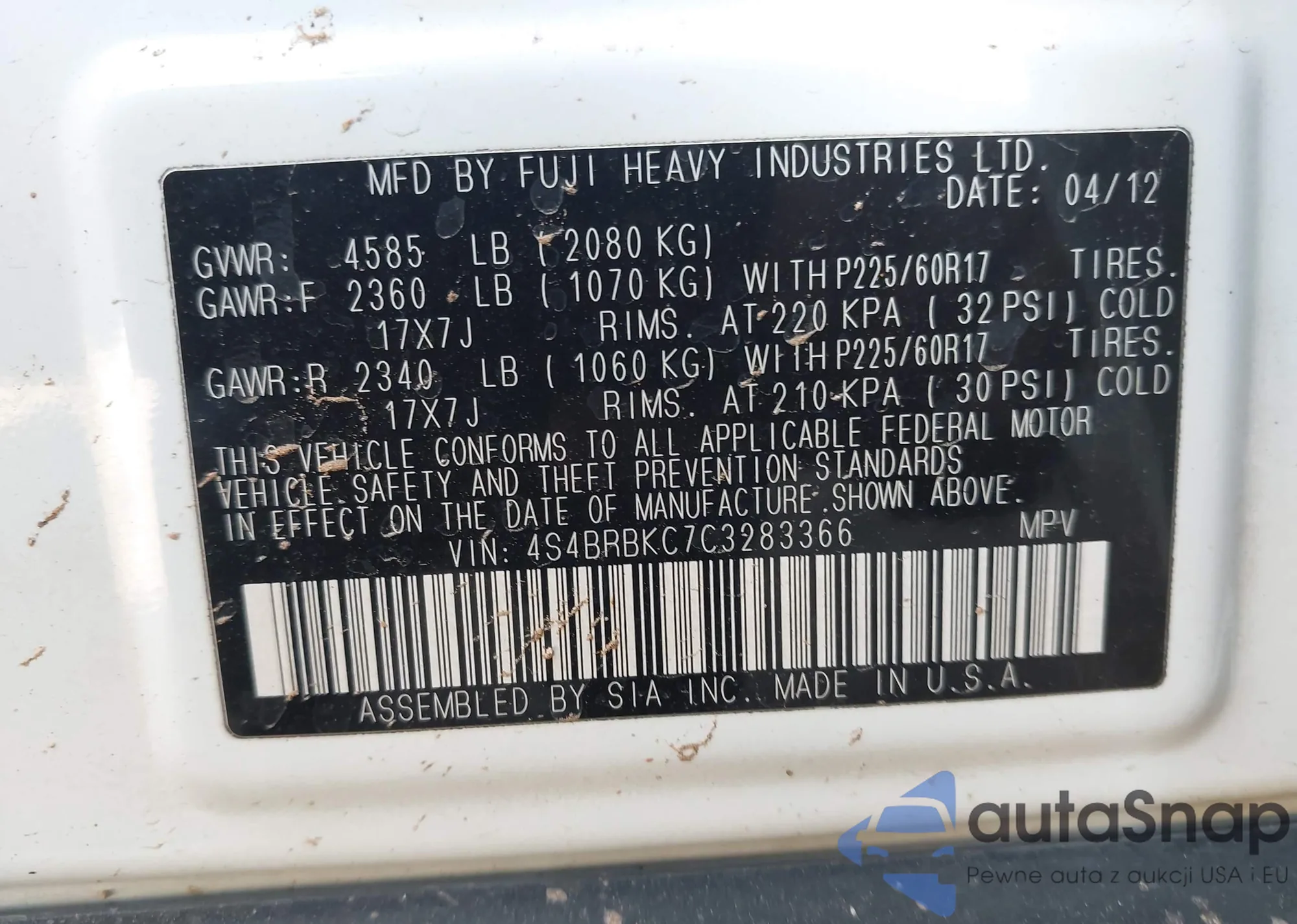 LOT: 42609682 VIN: 4S4BRBKC7C3283366