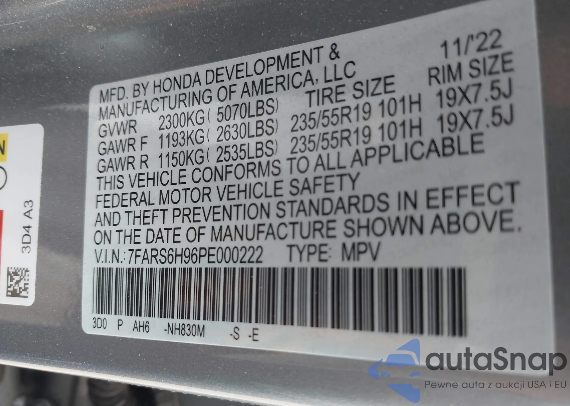 LOT: 42336036 VIN: 7FARS6H96PE000222