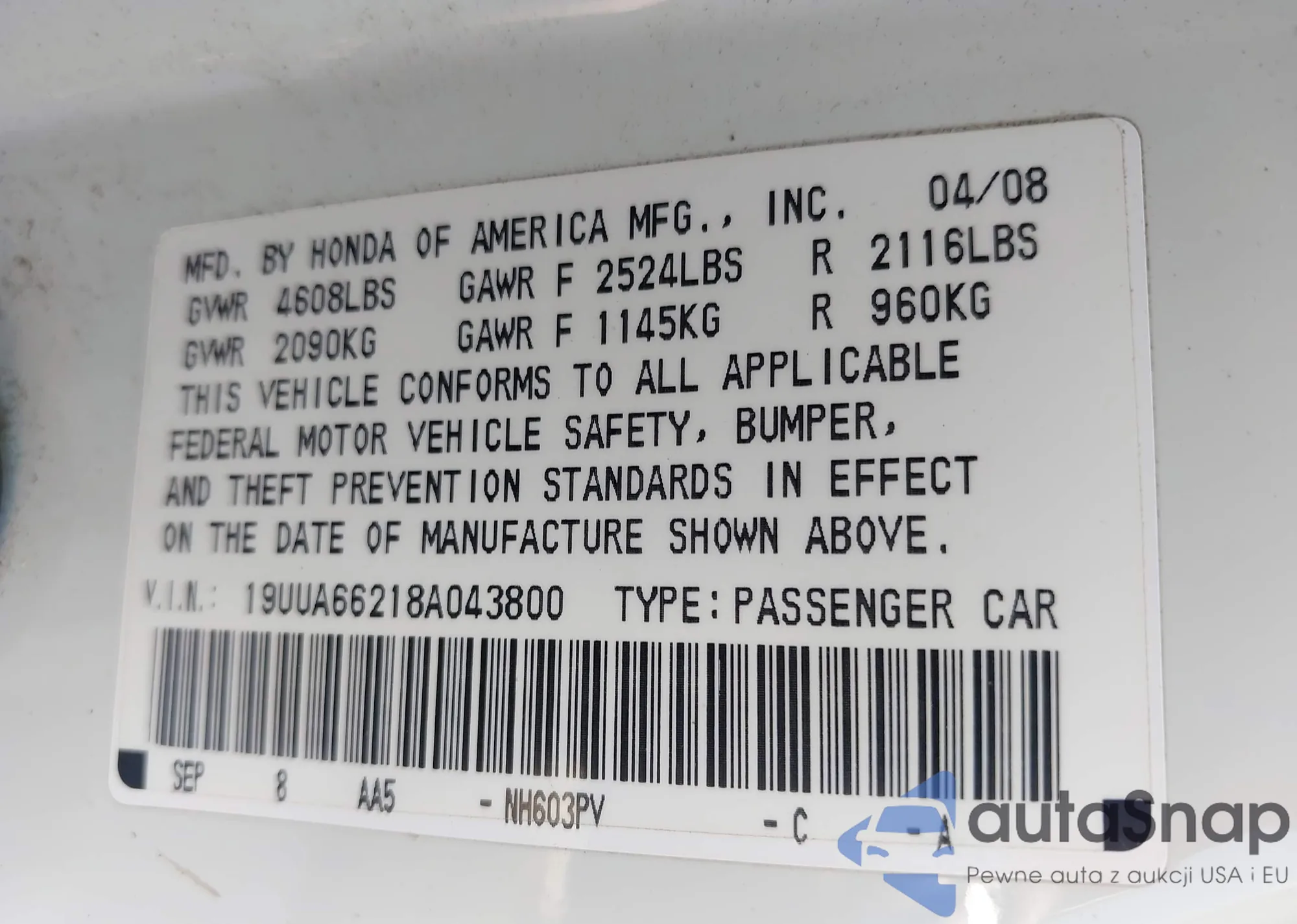 LOT: 42404761 VIN: 19UUA66218A043800