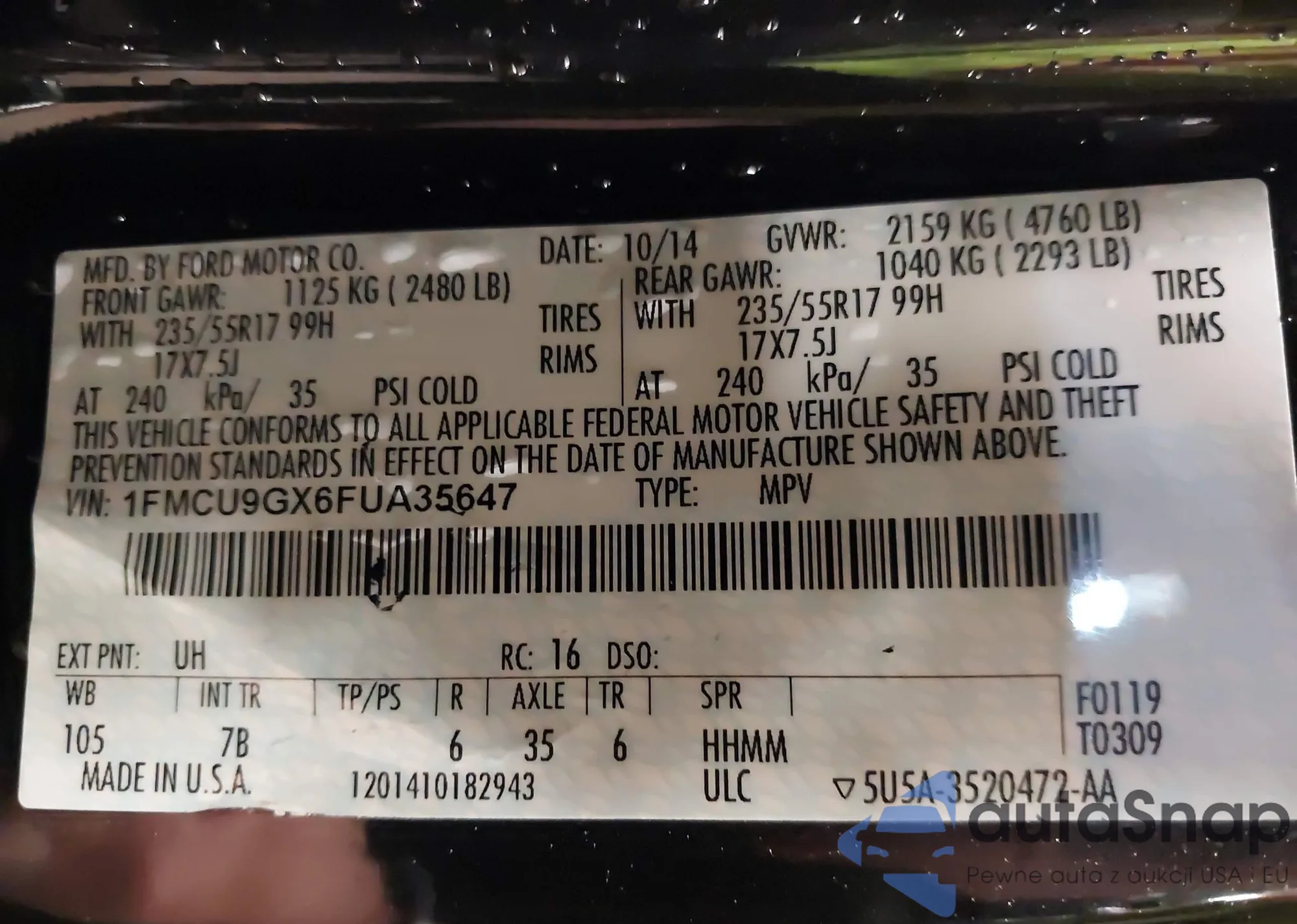 • VIN 1FMCU9GX6FUA35647