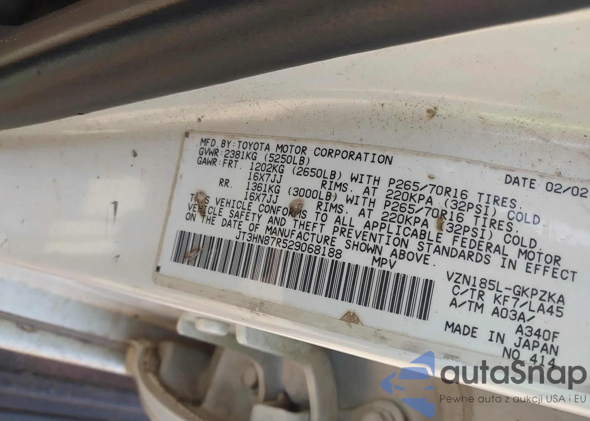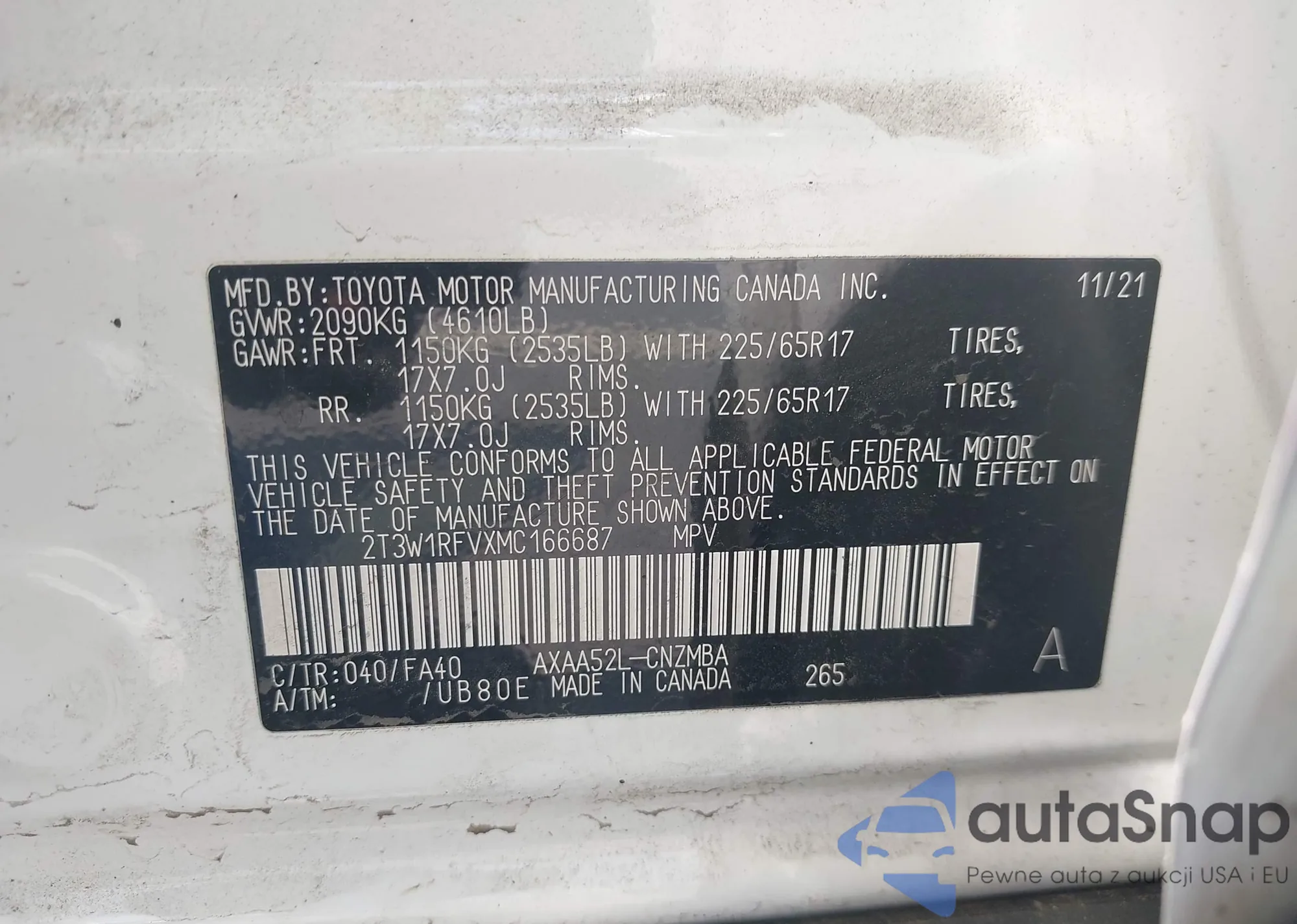 LOT: 42371071 VIN: 2T3W1RFVXMC166687