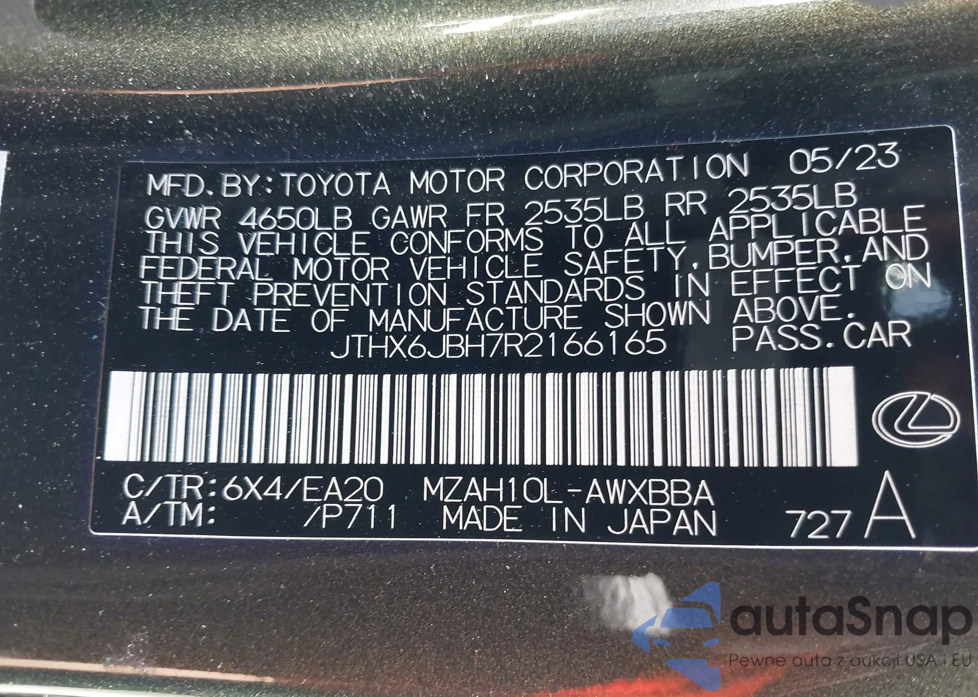 LOT: 42323215 VIN: JTHX6JBH7R2166165