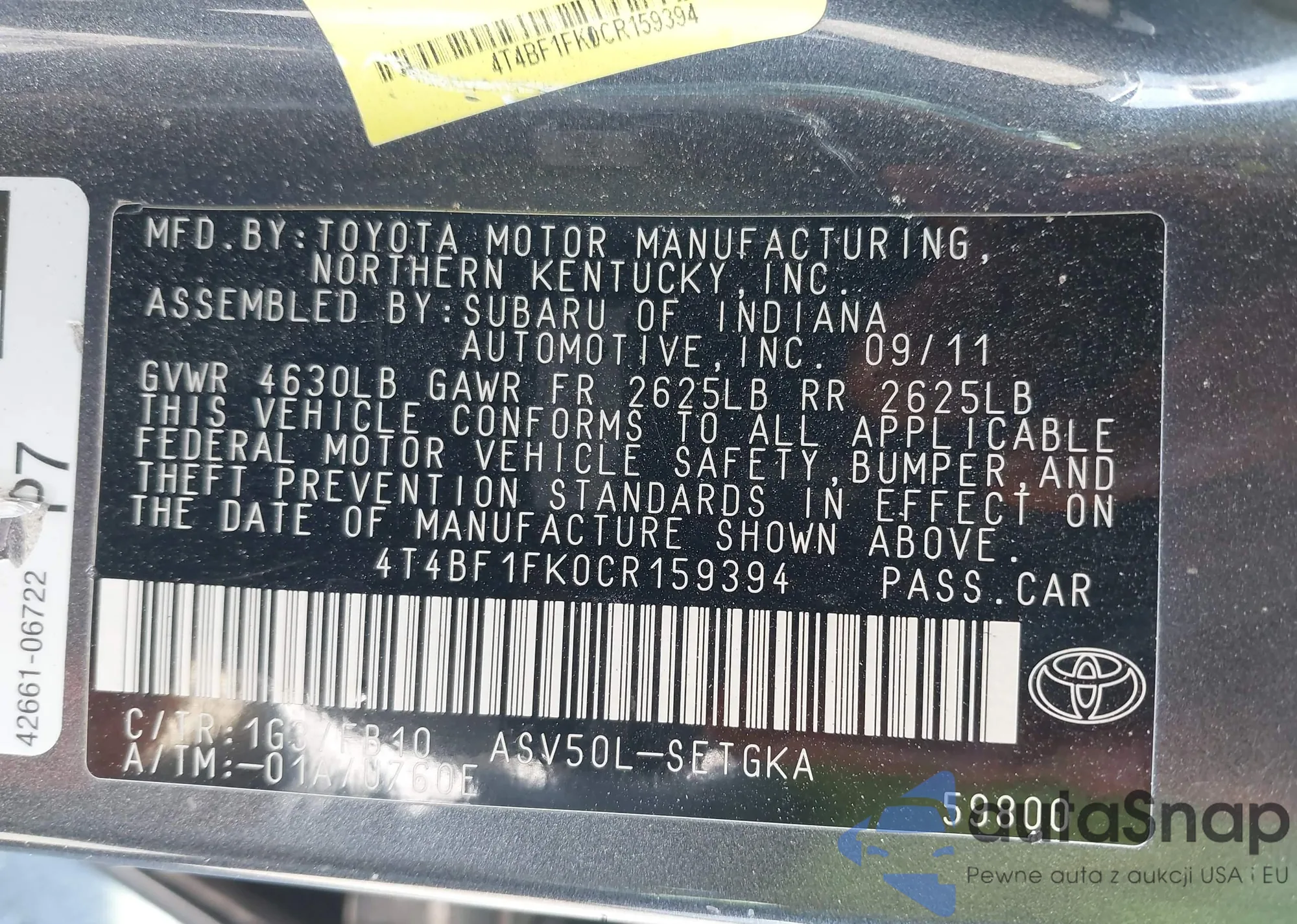 • VIN 4T4BF1FK0CR159394