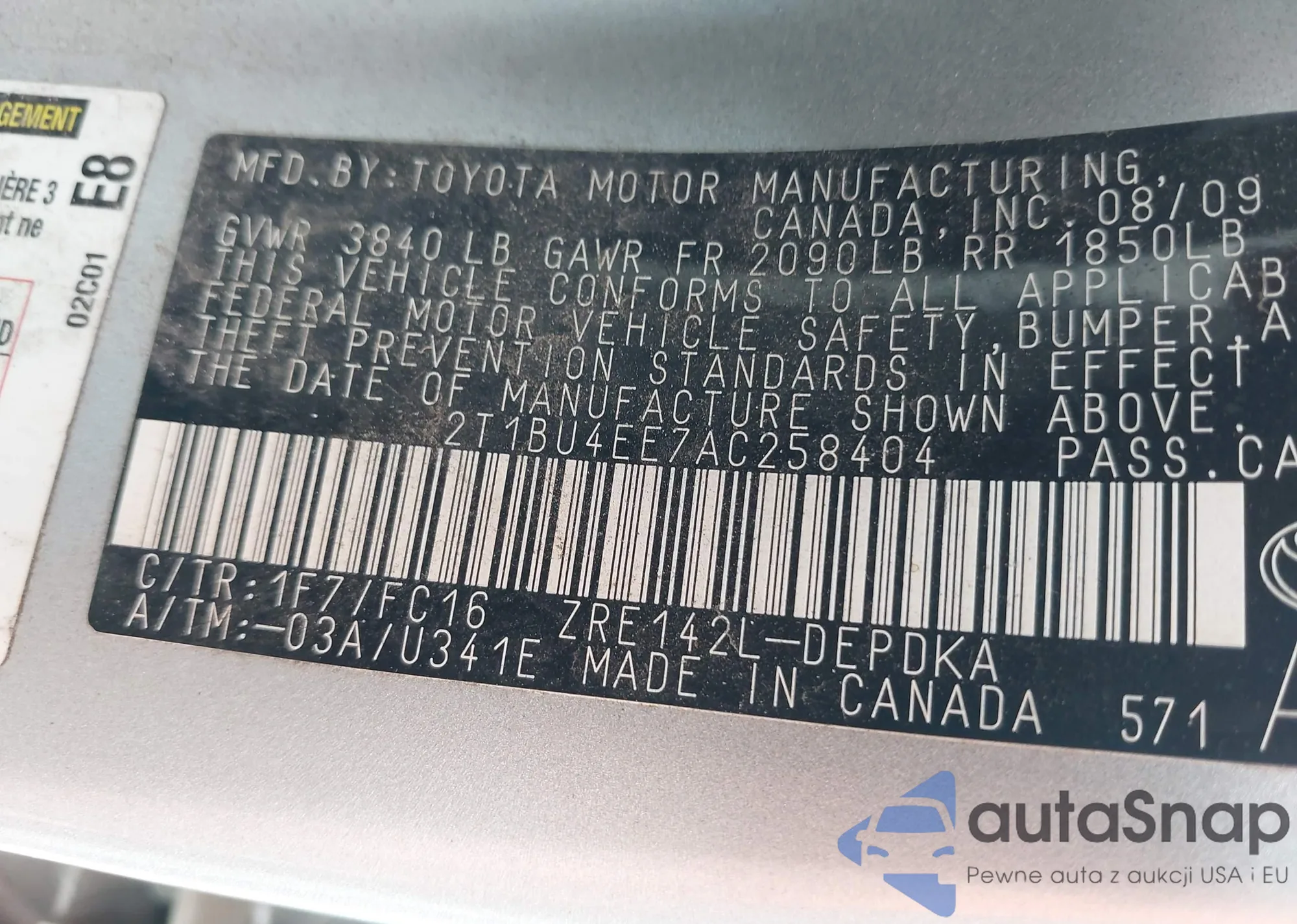 LOT: 42122934 VIN: 2T1BU4EE7AC258404