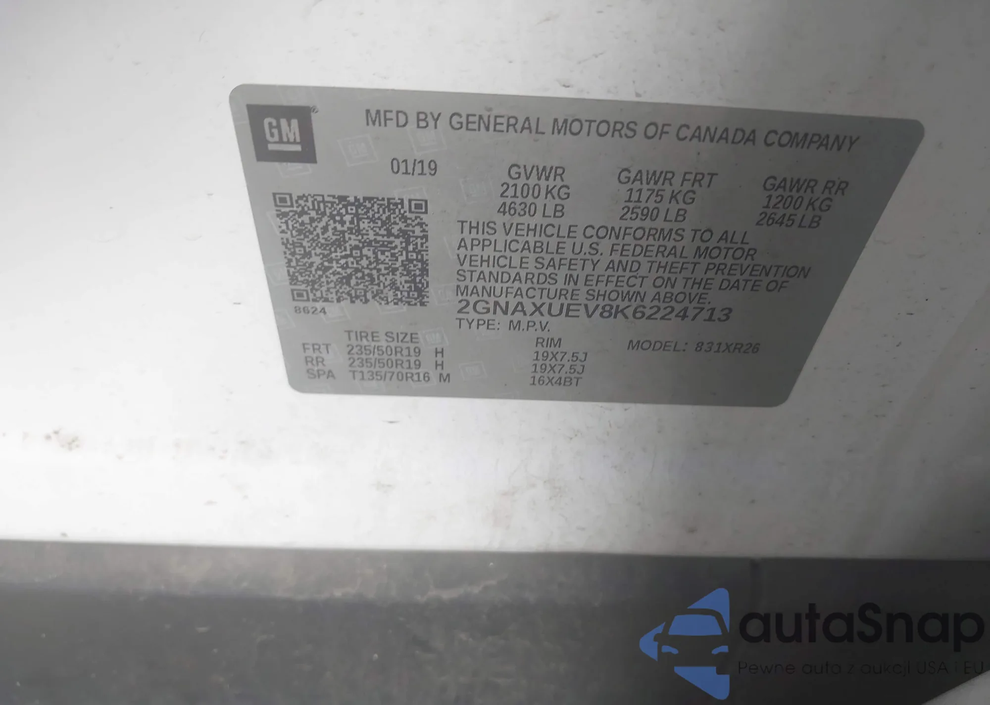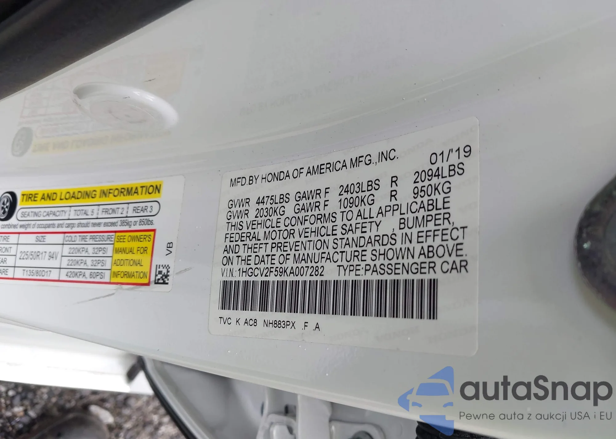 LOT: 42206630 VIN: 1HGCV2F59KA007282