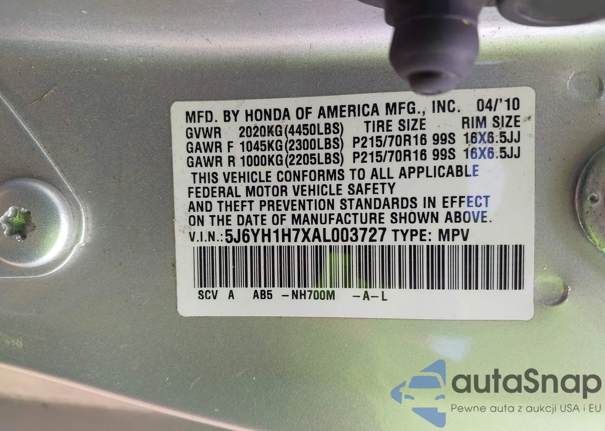 • VIN 2HKRW5H33KH412873