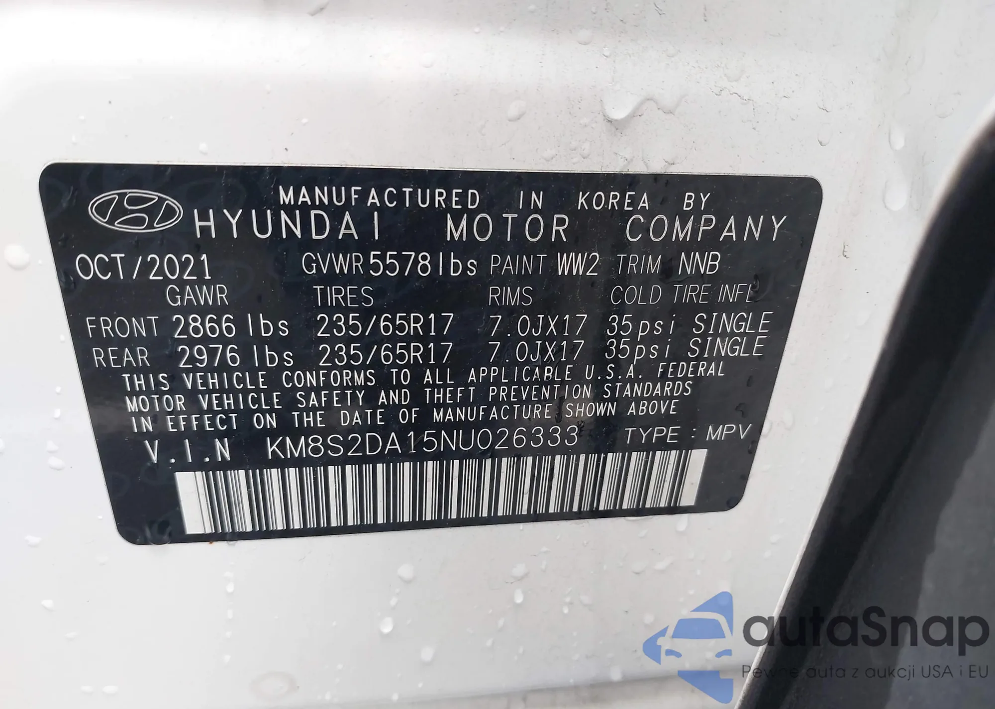 LOT: 42220058 VIN: KM8S2DA15NU026333