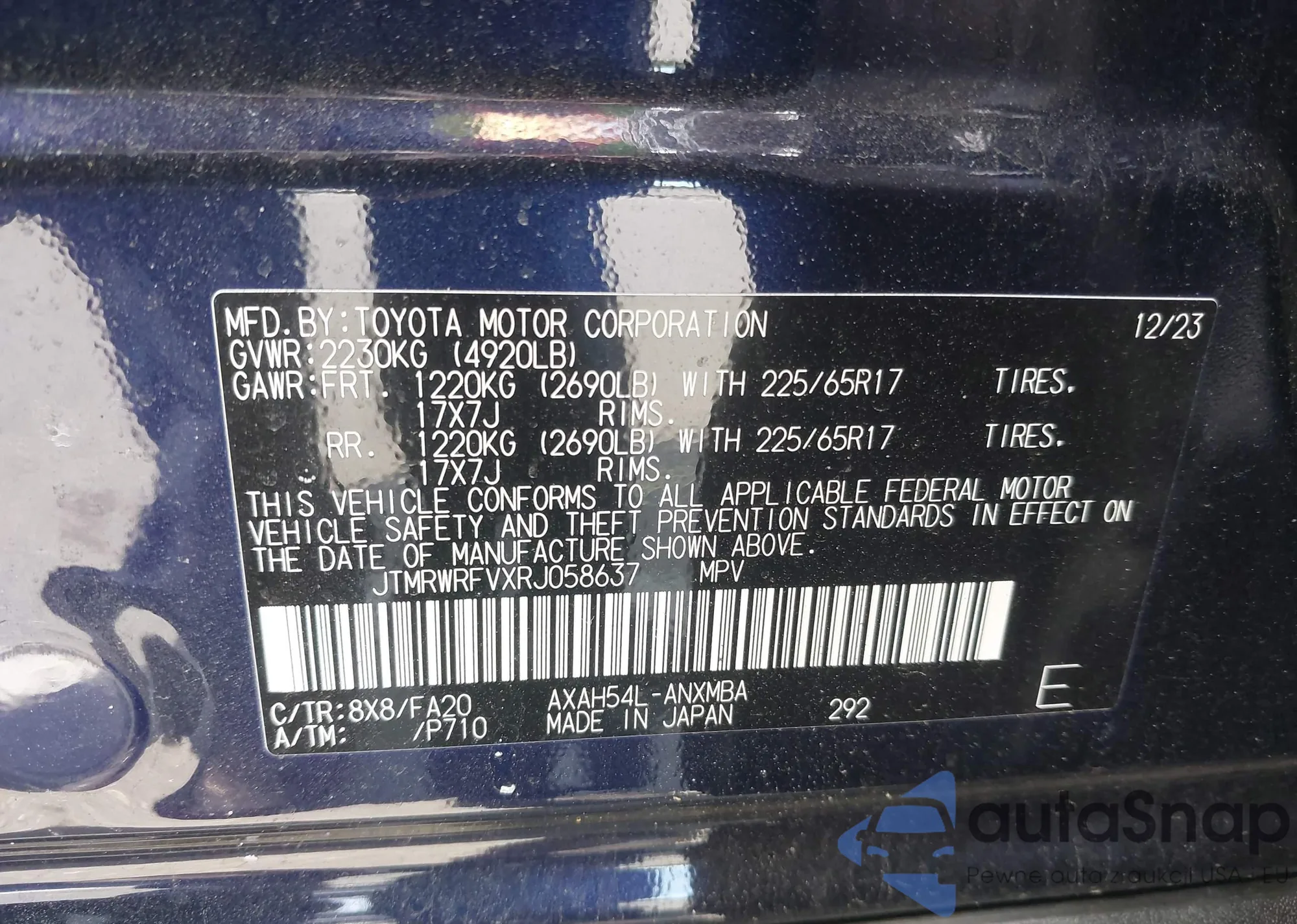 LOT: 42230352 VIN: JTMRWRFVXRJ058637