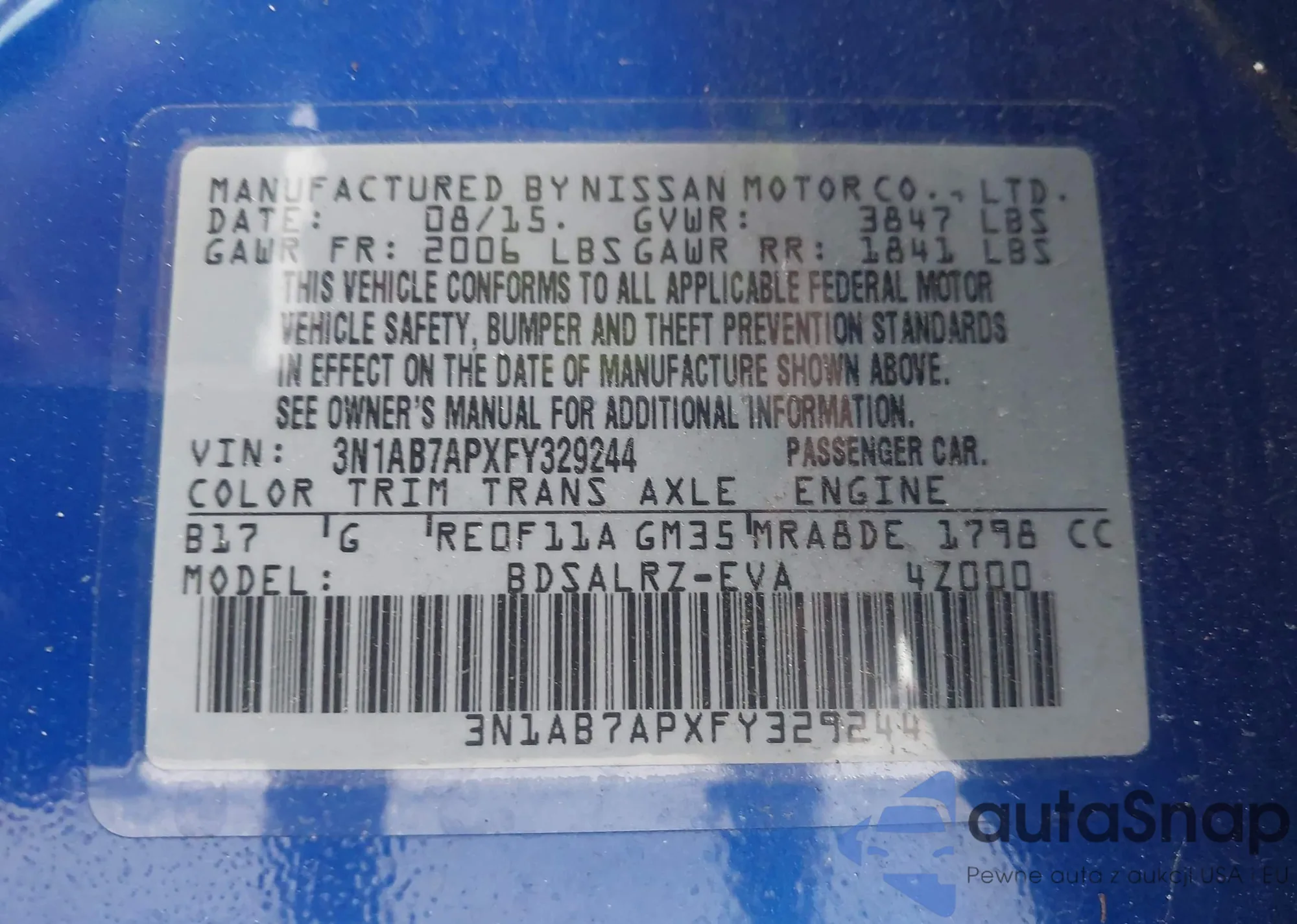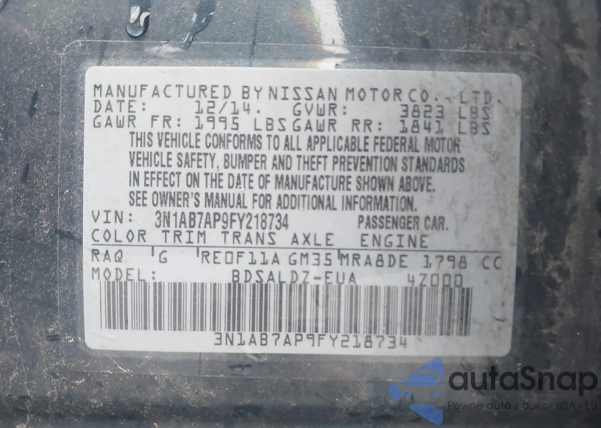 LOT: 42607456 VIN: 3N1AB7AP9FY218734