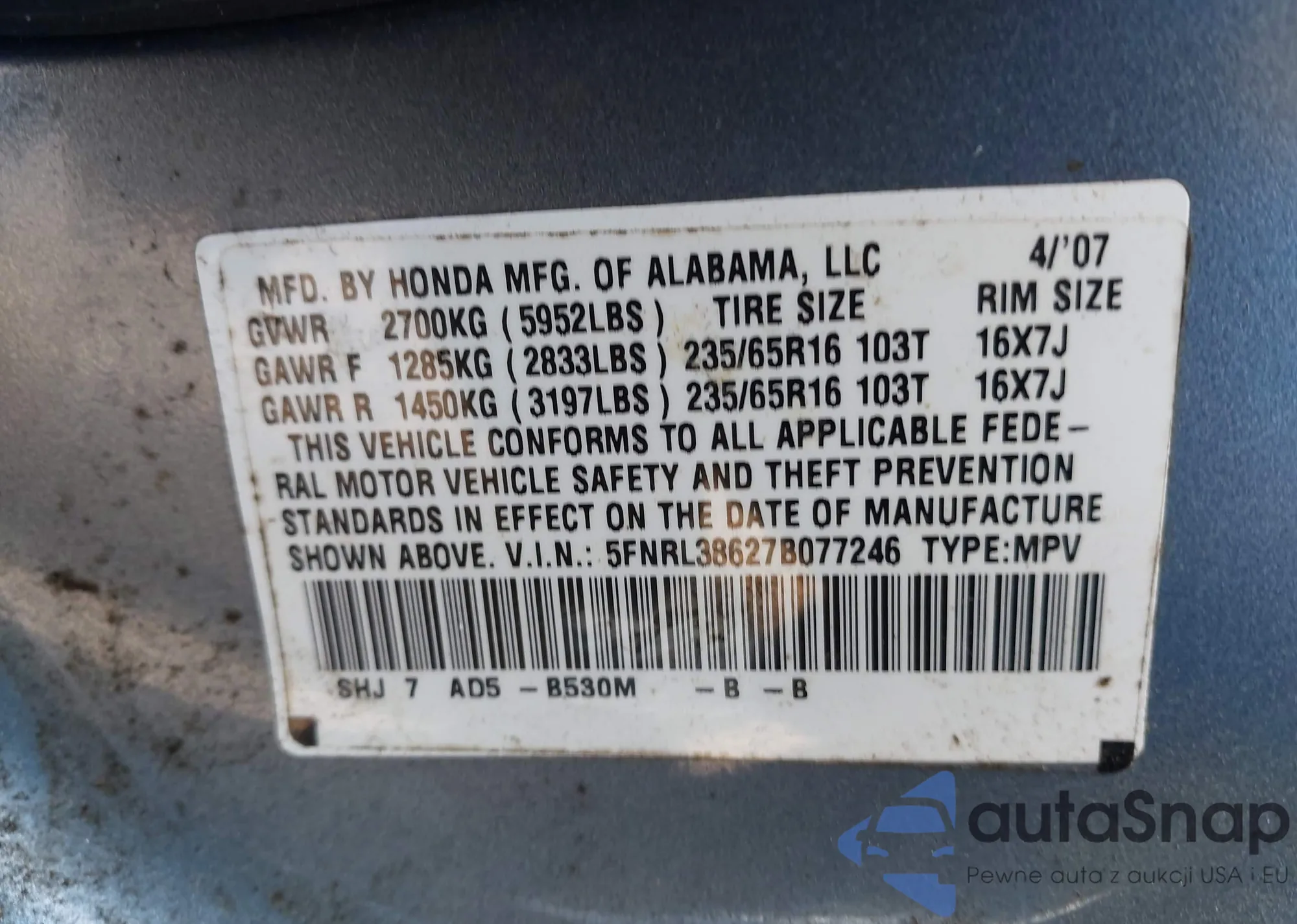• VIN 5FNRL38627B077246