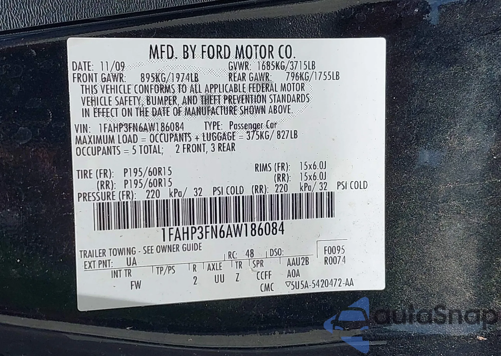 LOT: 42537439 VIN: 1FAHP3FN6AW186084